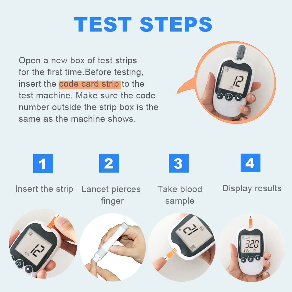 Примечание:1. Пожалуйста, используйте тест-полоски в течение 3 месяцев после открытия флакона.2. Откройте новую тестовую полосу в первый раз. Полоска кода должна быть вставлена только один раз перед использованием. Последующий прибор автоматически распознает тест-полосу.3. Операция должна быть завершена в течение 3 минут.