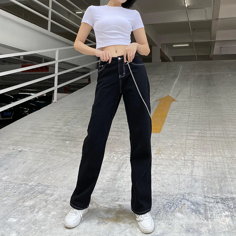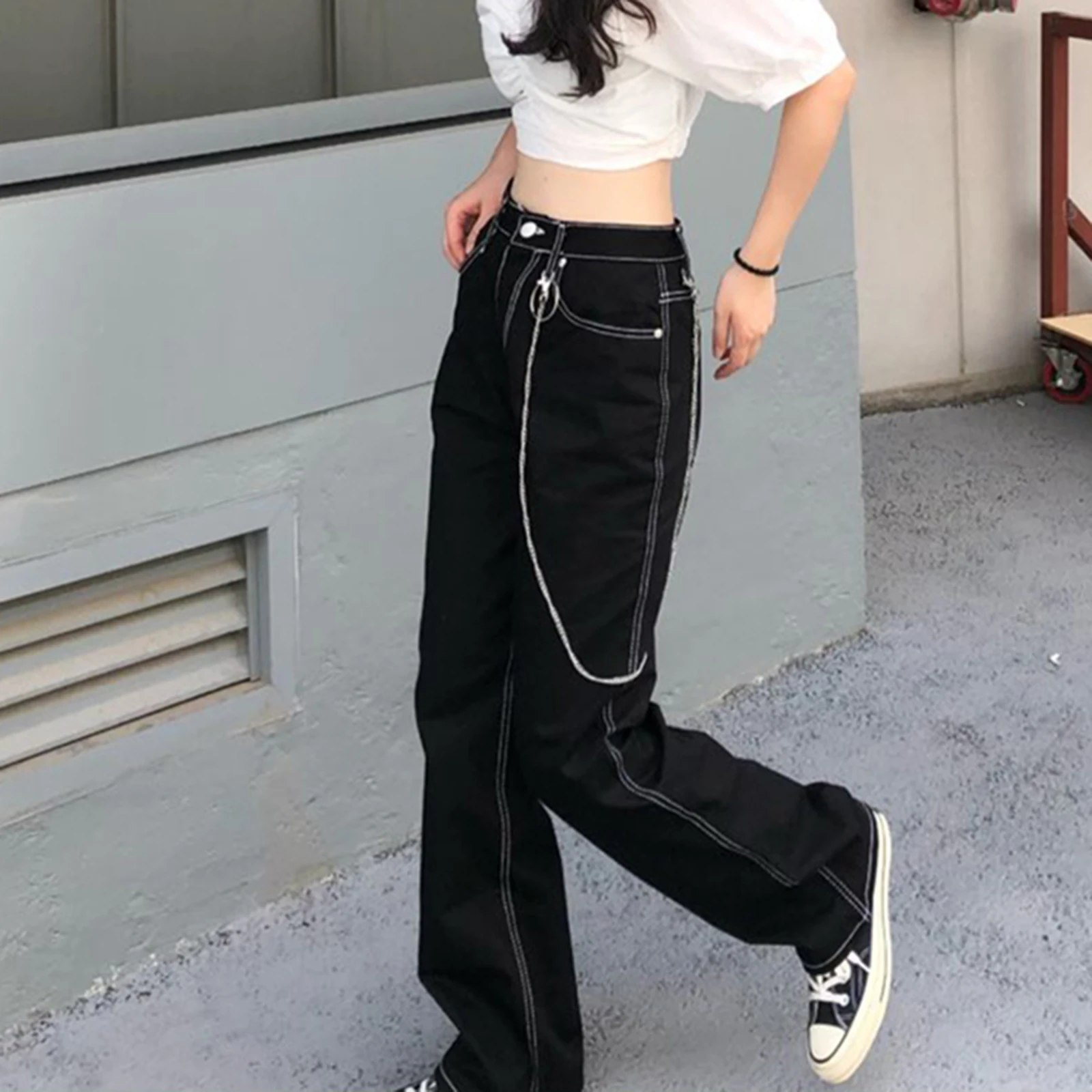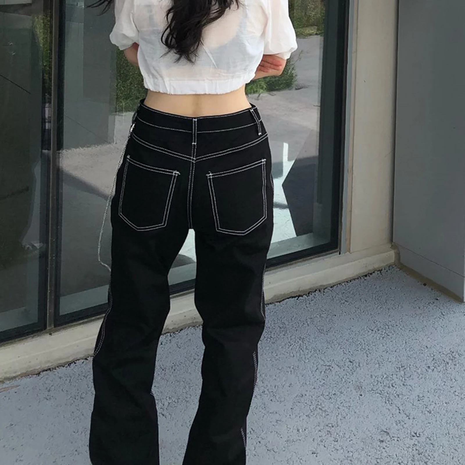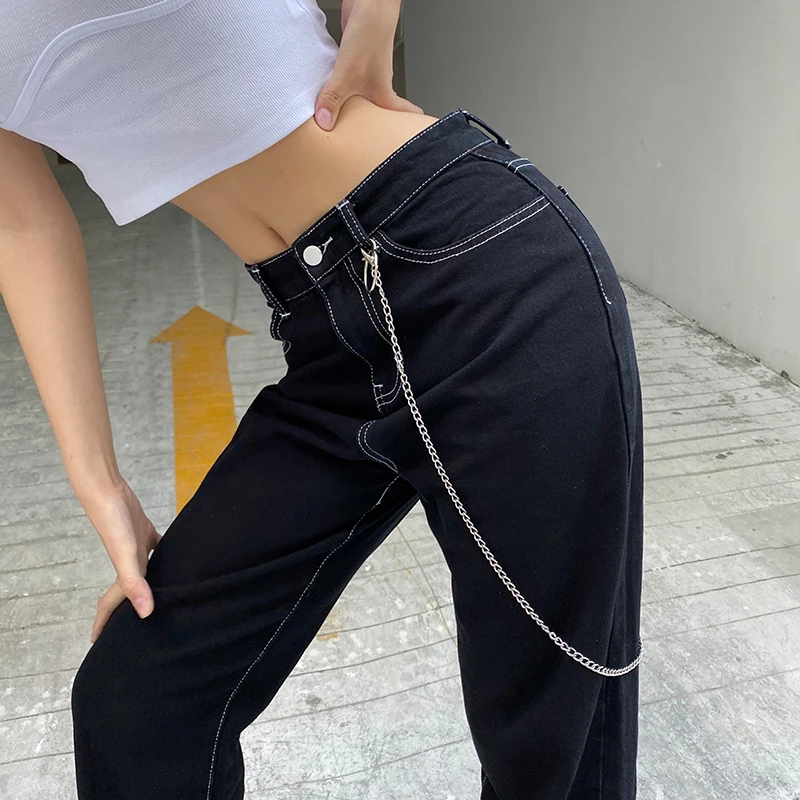 DEWADBOW с высокой талией, джинсовые штаны для женщин прямую нижнюю ногу в винтажном стиле; Уличная модная обувь с украшением в виде цепочки в готическом стиле, черные 2021; Сезон весна