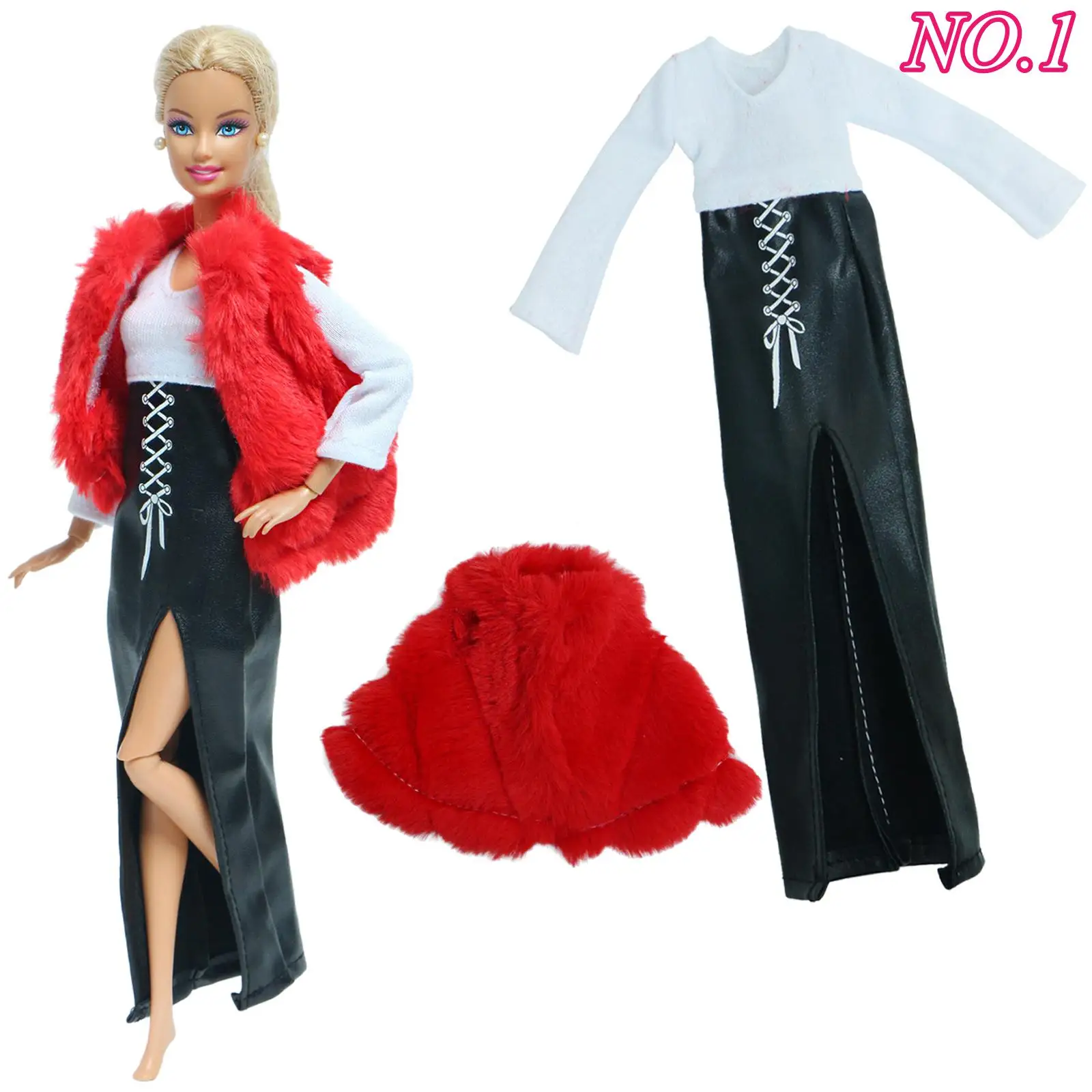 Комплект для куклы Барби, кожаное платье, красное меховое пальто, черная одежда на высоком каблуке, аксессуары для кукол, игровой домик