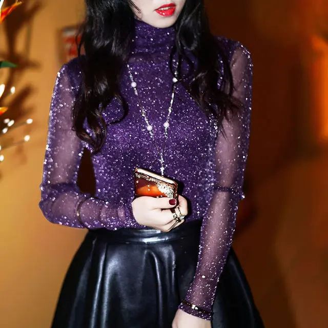 Женская прозрачная сетчатая блузка, элегантная блестящая рубашка с ...