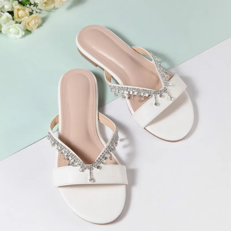 2021 Женская летняя обувь модные женские туфли на плоской подошве со стразами Женская Летняя обувь на плоской подошве, Жемчужная Нить бусина повседневные вьетнамки на плоской подошве открытый белые парусиновые туфли без задника с открытыми пальцами
