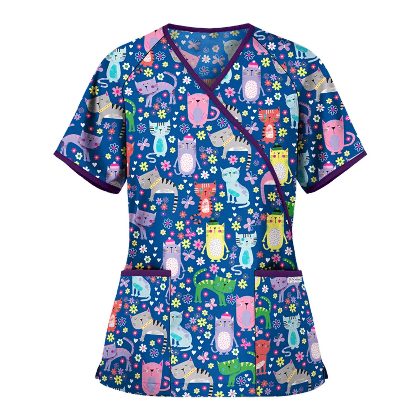 Женская одежда для кормления с мультяшным принтом, топы с коротким рукавом и V-образным вырезом, Рабочая форма, блузка с карманами и мультяшным принтом, униформа 2022