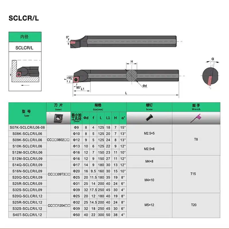 Спецификация режущей планки: например, s07k-sclcr06-16 S = Материал стержня инструмента легированная инструментальная сталь 07 = хвостовик 7 мм K = общая длина держателя инструмента S = тип винта C = какая форма лезвия использовать, соответствующая первой букве спецификации лезвия L = угол резки лезвия после установки оправки C = задний угол используемого лезвия, соответствующий второй букве используемой спецификации лезвия R = Положительный нож 06 = представляет размер используемого лезвия (длина одной режущей кромки лезвия), соответствующий первым двум цифрам шести цифр в спецификации лезвия, 06 = ccmt060204 -16 = хвостовик 16 мм