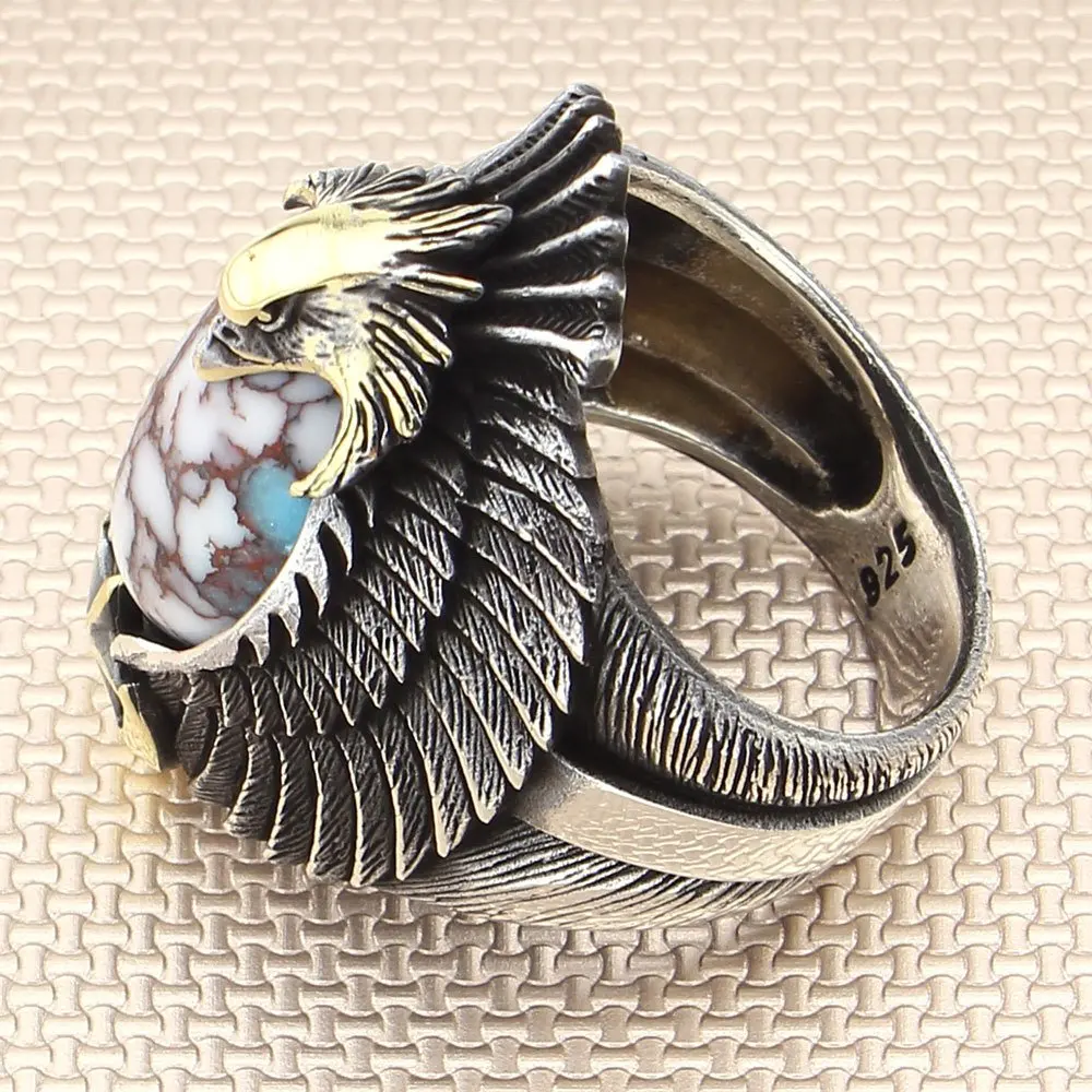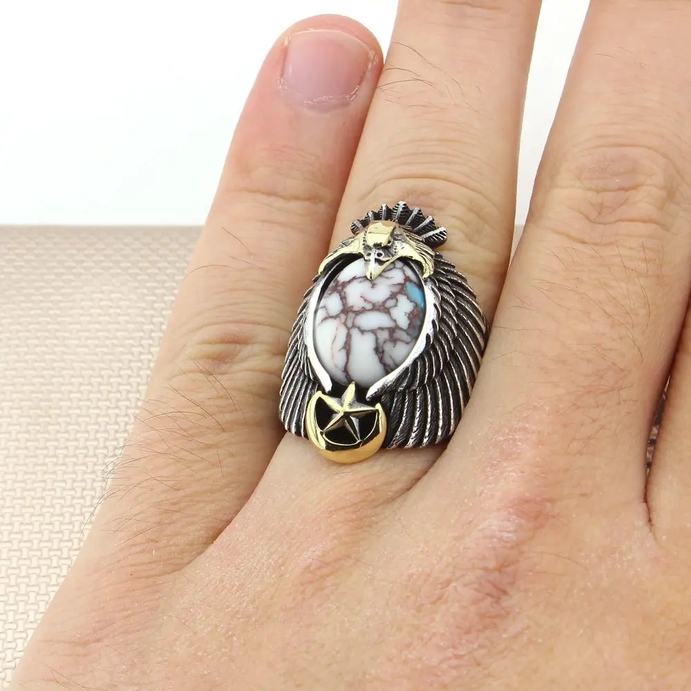 Стерлингового серебра 3D Орел Стиль Полумесяца звезда кольцо из белого кольцо с бирюзовым камнем Турецкая ювелирные изделия Для мужчин для колец, сувенир, брелок, производство Турция
