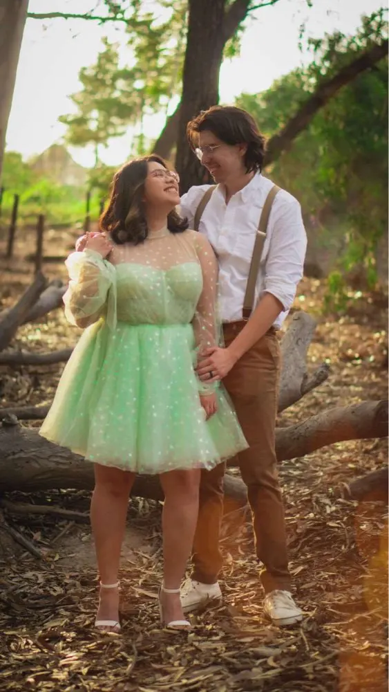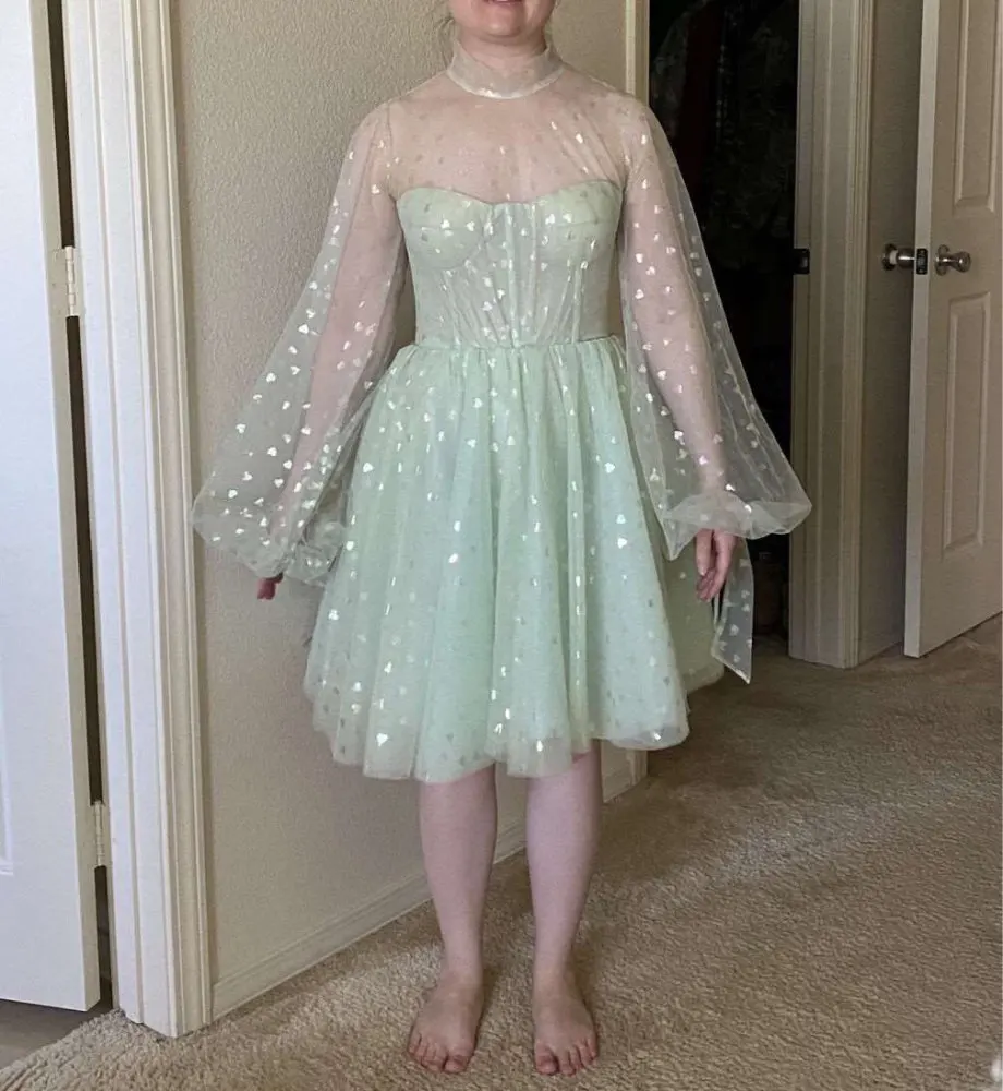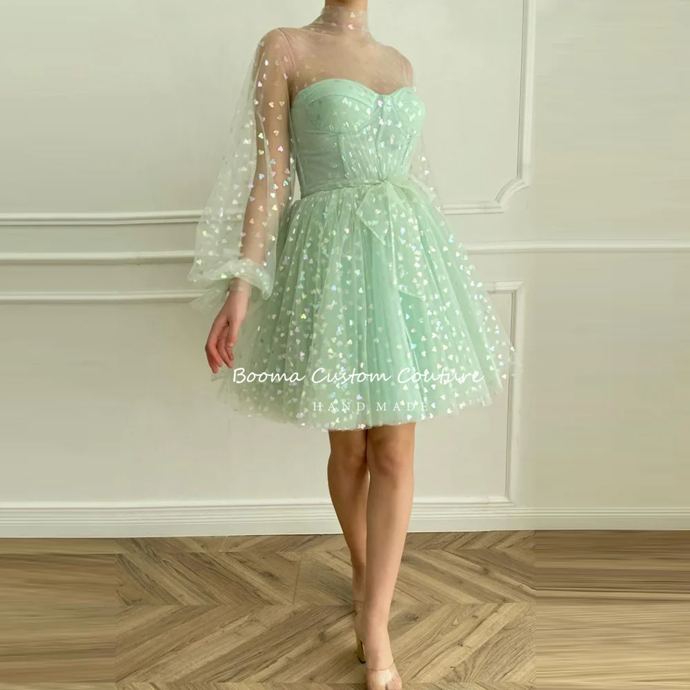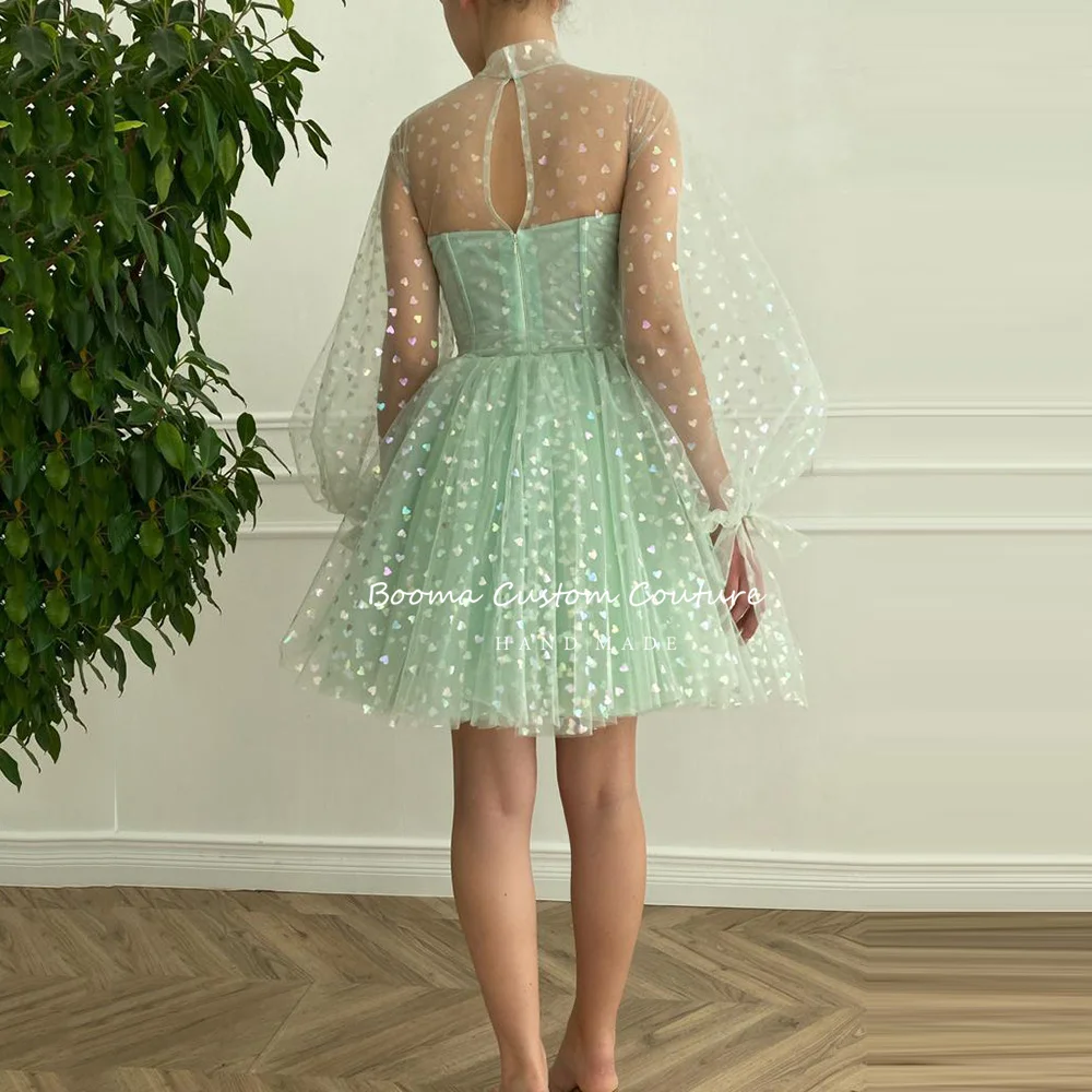 Платье мятно-зеленое вечернее из тюля выше колена, с длинными рукавами-фонариками и принтом сердец, мини-Выпускные платья