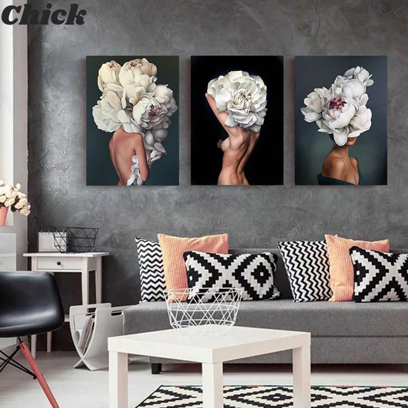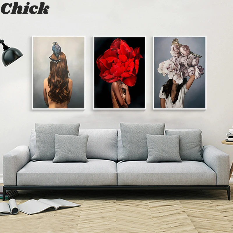 Абстрактная Картина на холсте с цветами и перьями для женщин, настенный художественный плакат, украшение для гостиной и дома