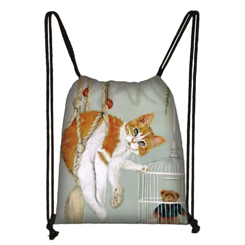 Женская Холщовая Сумка на шнурке с принтом головы кота, популярная женская сумка для покупок, подарок