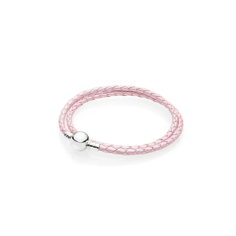 Кожаная обложка розового цвета браслеты из нержавеющей стали для женщин Подпись круглый застежка 925 стерлингового серебра ювелирные изделия плетеный браслет-цепочка DIY Женская плетеная веревка