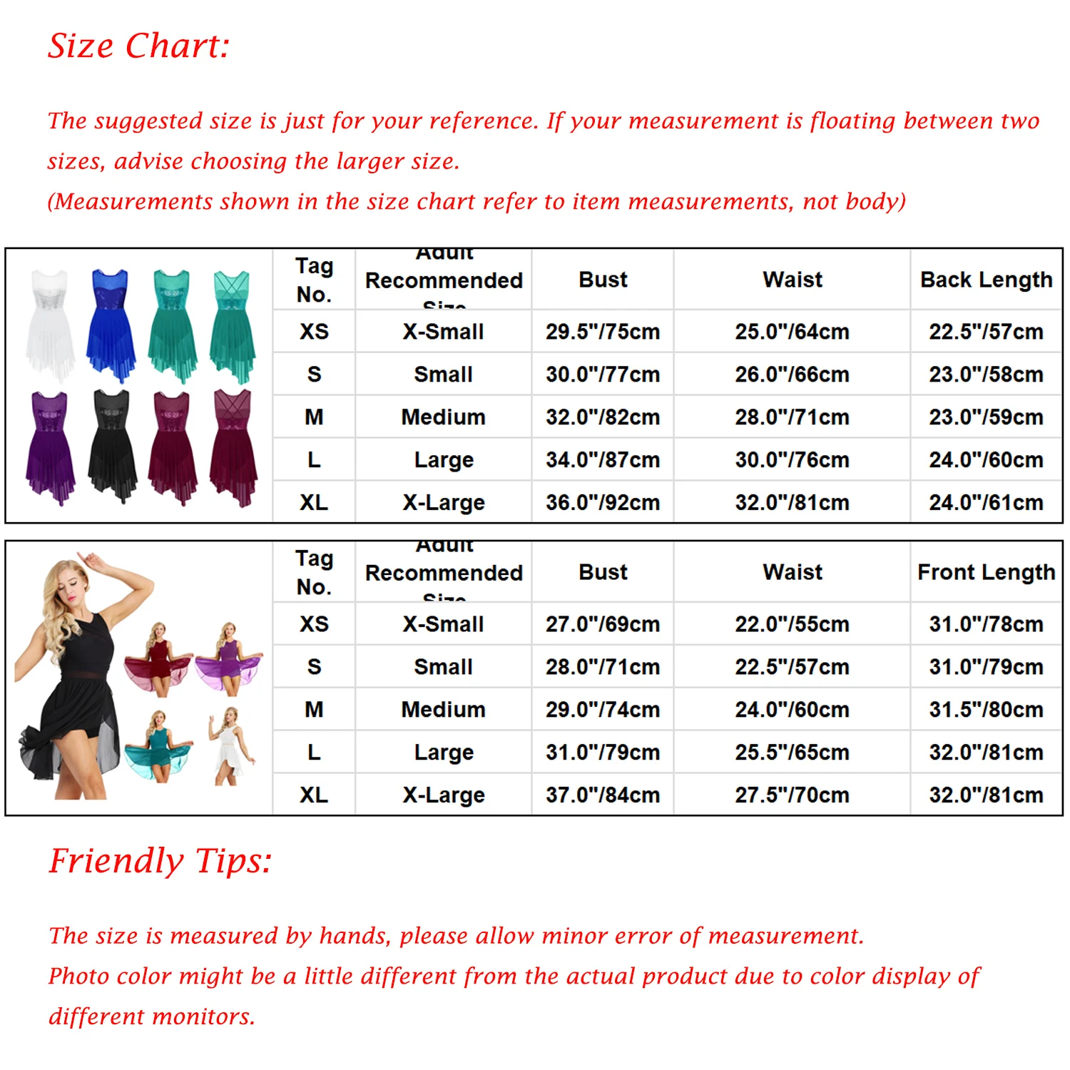 Женское платье для танцев без рукавов для взрослыхГлубокий вырез и вырез сзади; 1 многослойная шифоновая юбка с разрезом спереди.Хорошая эластичная ткань, очень мягкая и гладкая, дышащая, удобная в носке.Подходит для занятий танцами, гимнастическое упражнение, соревнований и выступлений и т. д.Пожалуйста, внимательно ознакомьтесь с таблицей размеров, приведенной ниже, прежде чем разместить заказ, ручная или машинная стирка.