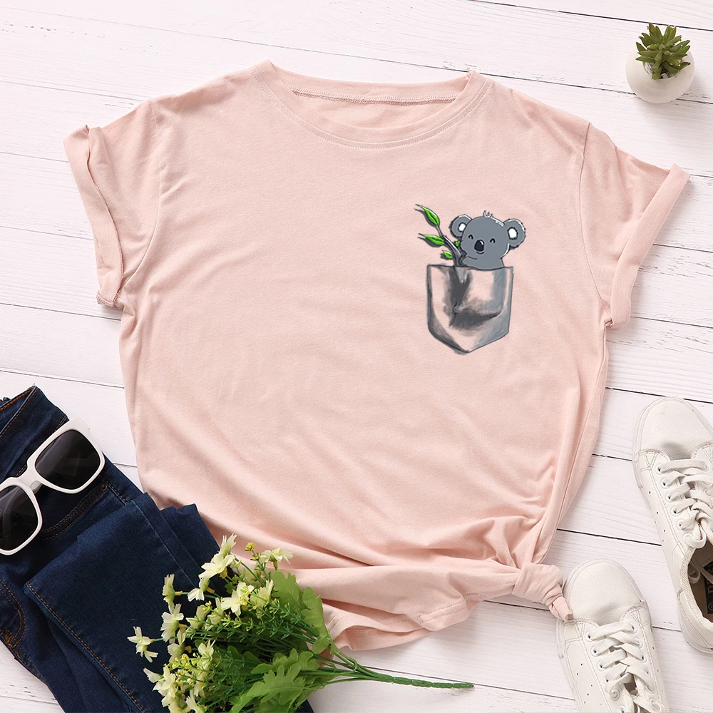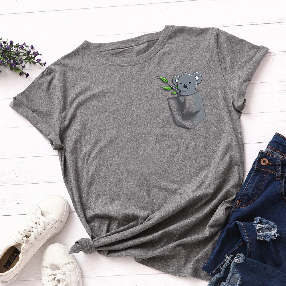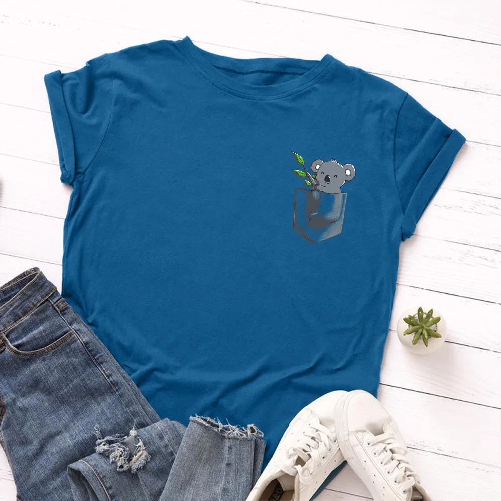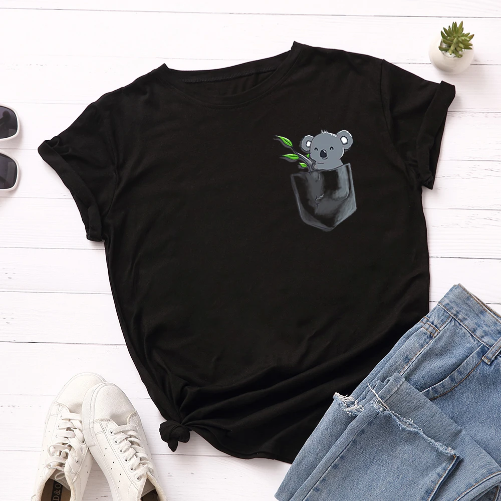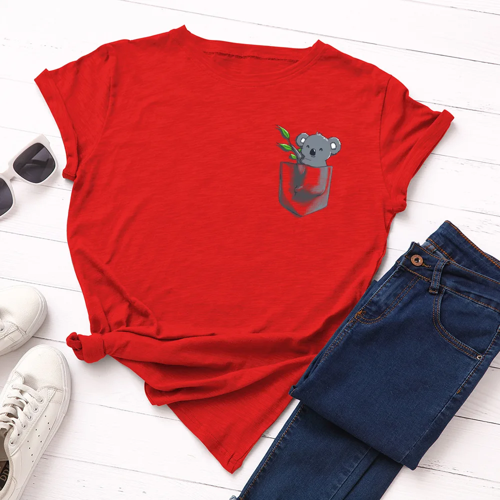 Милая футболки с коалой с карманами для женщин, хлопковая Футболка с рисунком, Женский Топ с коротким рукавом, топ для влюбленных животных, коала, медведь, на лето