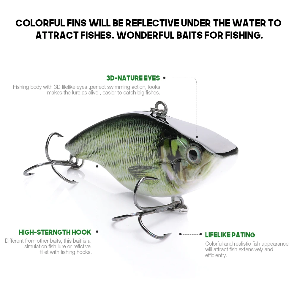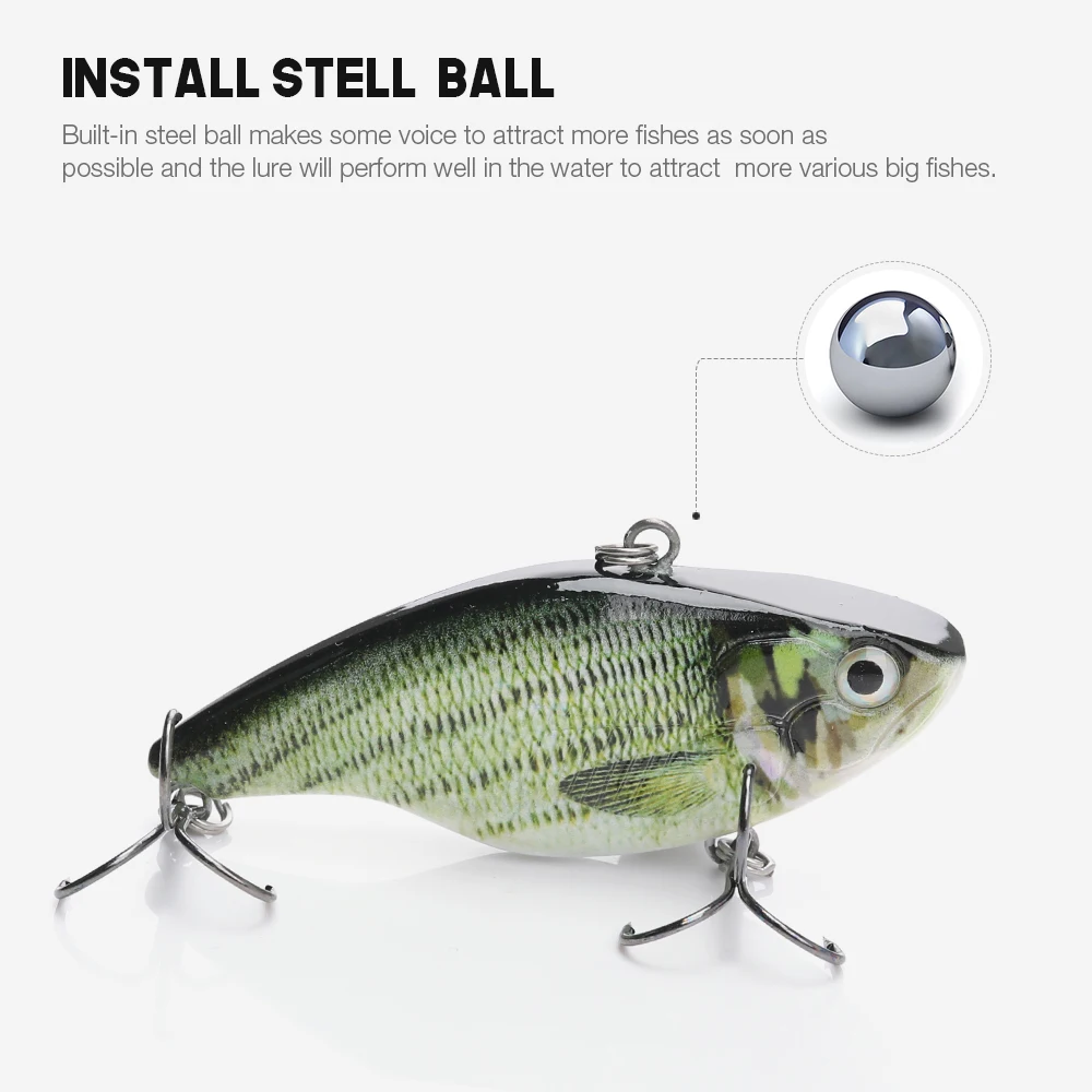 2) Гремящий стальной шар внутри приманки, чтобы сохранить баланс, предлагает реалистичные плавательные действия в воде. Дизайн шумовой модели, делает VIB более легко быть воспринимаемым.