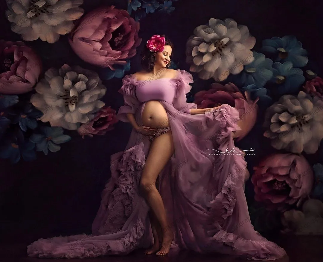 Тюлевые платья с длинным шлейфом для фотосессии беременных с цветоч...