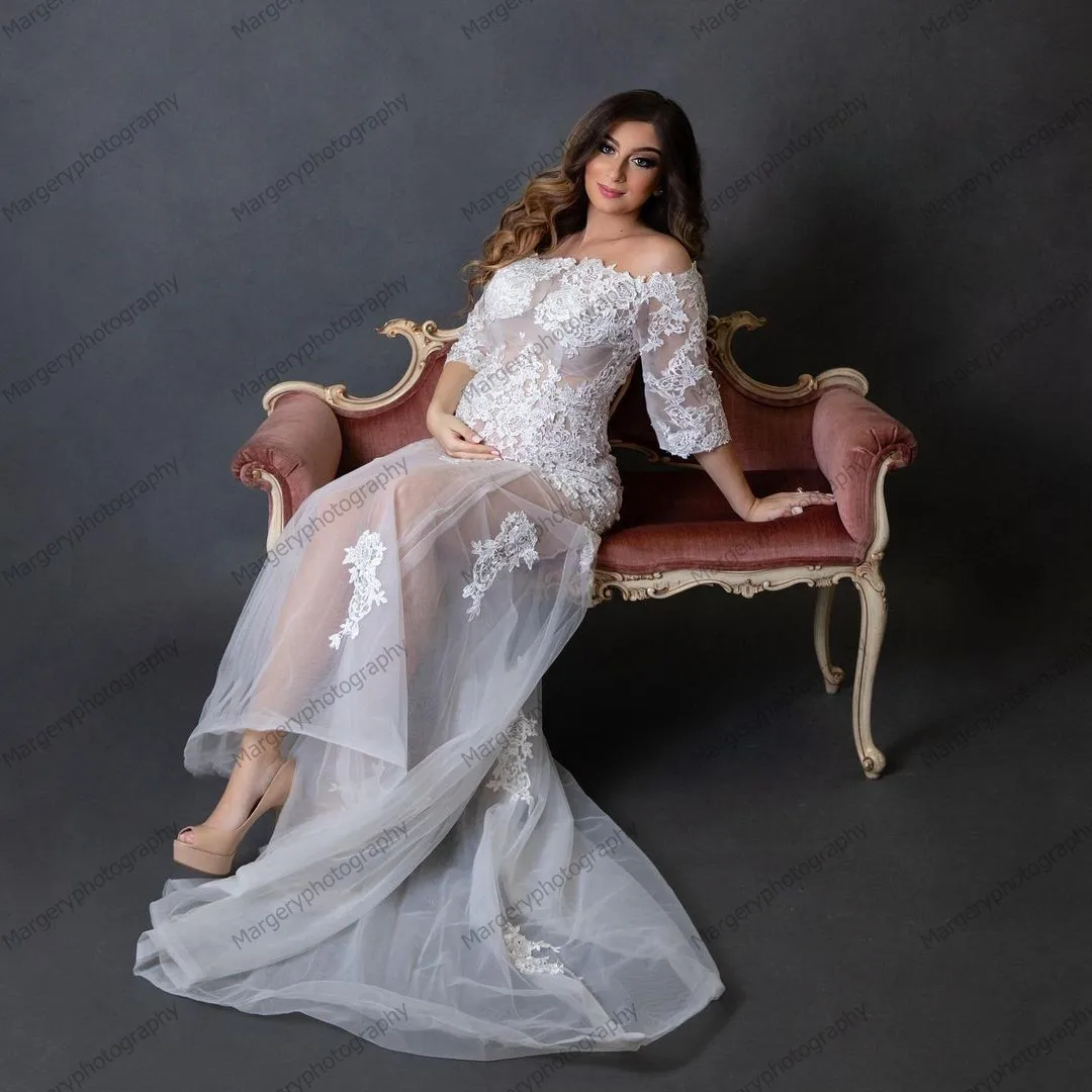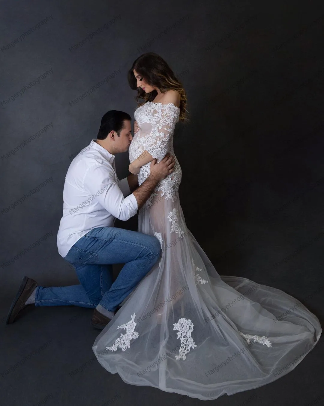 Элегантное Белое Кружевное Тюлевое длинное платье с оборками для фотосъемки сексуальные сетчатые платья для беременных с открытыми плечами