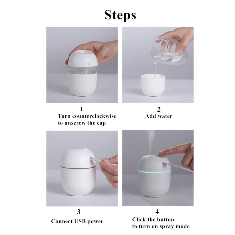 Цвет: белый, синий, розовыйНазвание: USB увлажнительРабочее напряжение: 5 В постоянного токаМатериал: силикон/ПП/АБС/электронный компонентКоличество распылителя: 40 мл/чРабочий ток: 400mAЕмкость резервуара для воды: 220 млВремя использования: 5-10 чИсточник питания: USBПрименимая площадь: 10-20 квадратных метровШум: Менее 36 дБОсобенности:1. Супер тихий: работает бесшумно. Это не будет разрушительным во время сна2. Большая емкость, сухая защита, инфильтрация и увлажнение3. Автоматическая защита от сбоя питания, защита от сухости4. Мини-размер, легкий и компактный, легко носить с собой