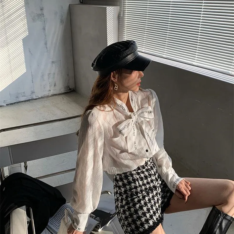Корейские элегантные кружевные рубашки Nomikuma с буквенным бантом с длинным рукавом Женские блузки 2021 Весна Осень Новые женские модные блузки 6F437
