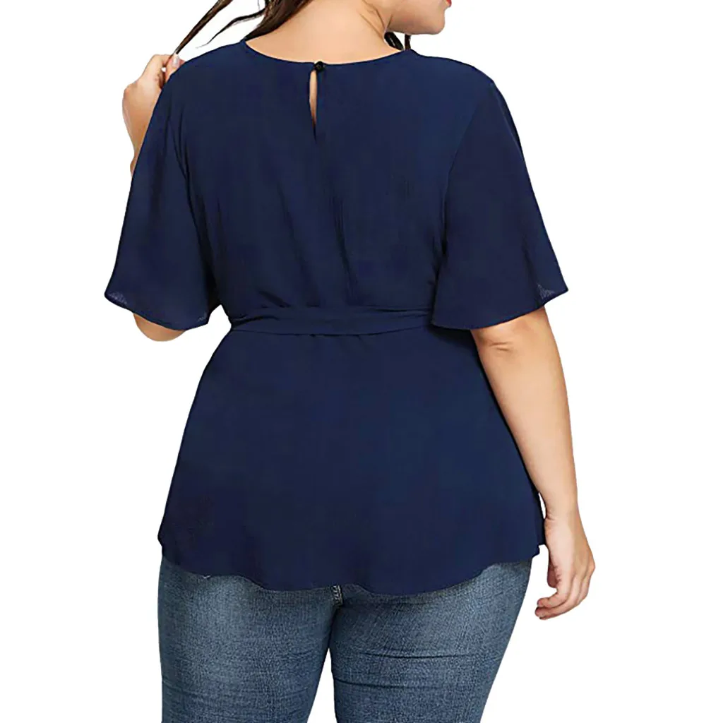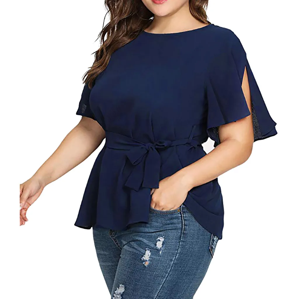 Женская Однотонная рубашка с коротким рукавом размера плюс с поясомБлузка-топ