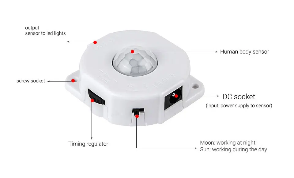 Примечание: При тестировании, пожалуйста, проверьте в темной среде. Между тем, пожалуйста, проверьте «вход» и «выход» перед включением. Или свет не будет работать должным образом. Характеристики: Материал: пластик Цвет корпуса: черный/белый Тип: светильник с датчиком PIR Рабочая температура: от-20 до + 60 °C Входное напряжение: 5-24 В постоянного тока Выходное напряжение: 5-24 В постоянного тока Индукционное расстояние: 5 м Угол индукции: 120 градусов Выходной ток: <8A Время задержки: 15 с-5 мин (регулируется)