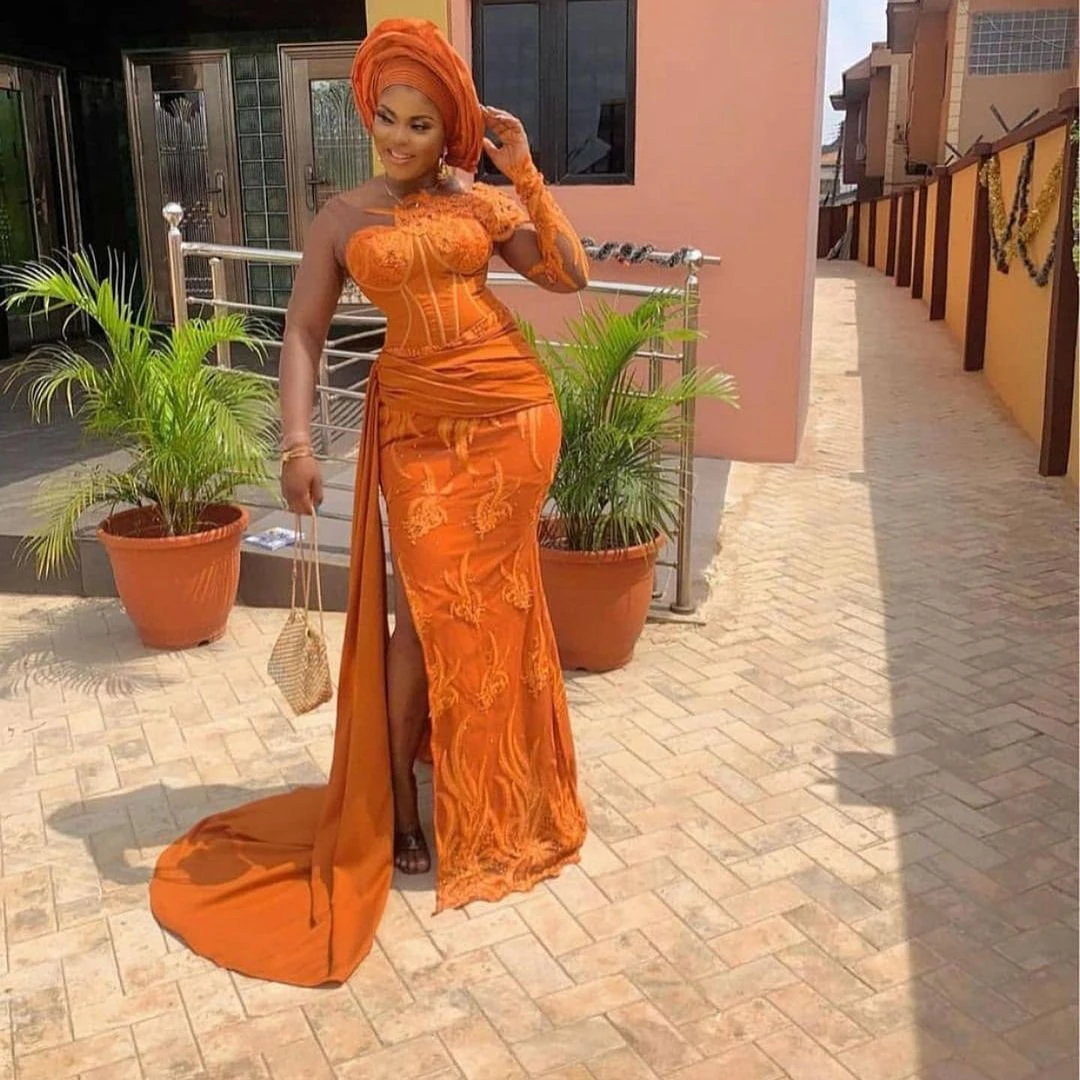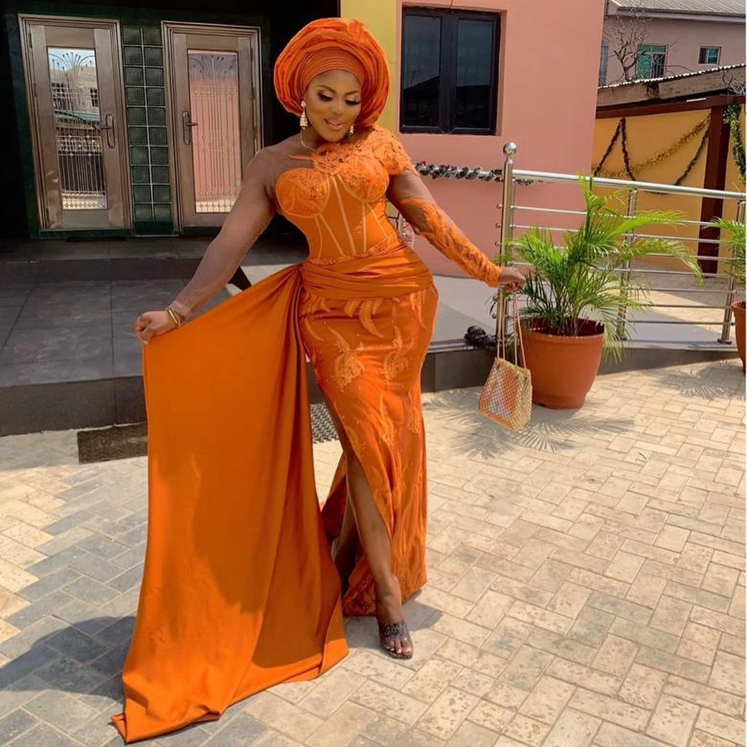 Элегантное оранжевое платье для выпускного вечера Aso Ebi с длинными рукавами и Боковым Разрезом, с нарукавниками, атласное искусственное оформление на заказ