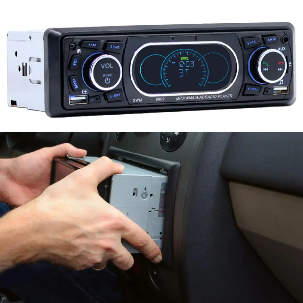SWM-8809 многофункциональный двойной USB Hands-free Звонки Bluetooth в автомобиле Hands Free MP3-плеер Описание: Умный MP3-плеер Bluetooth может подключать мобильный телефон по Bluetooth для воспроизведения музыки, развлечений и навигации по карте через автомобильный стерео, который может расширить развлекательный диапазон в автомобиле через воспроизведение аудио автомобиля. Он поддерживает WAV, MP3, WMA формат музыки и может обеспечить безопасность вашего диска. С большим дизайном кнопок и функцией идентификатора звонящего, MP3-плеер Bluetooth очень удобен для ответа/зависания звонков, зарядки ваш мобильный телефон и диск. Благодаря автоматическому сочетанию функций Bluetooth, умный чип MP3-плеера Bluetooth может автоматически совпадать с Bluetooth, он имеет сильный сигнал и совместим с системой Android/Apple, обработка фонового шумоподавления делает автомобильные музыкальные телефонные звонки более четкими. Более того, он имеет fm-радио, отображение времени переключения и может прехранить 18 радиостанций, что удобно и быстро смотреть время и гарантирует безопасность вождения. Функция воспроизведения памяти отключения питания может запоминать частоту/трек, после выключения и перезапуска песня начнет воспроизводить из отключенной песни. Изготовлен из пластика и металлических материалов, который является прочным, удобным в использовании. Длина Музыкального Проигрывателя Bluetooth составляет 188 мм, ширина-58 мм, а высота-68 мм. Подходит для воспроизведения музыки, развлечений, навигации по карте во время вождения. Название товара: Автомобильный MP3 музыкальный плеер Материал: пластик, металл Совместимые модели: SWM-8809 Батареи: со встроенным аккумулятором CR2025 150 мАч на пульте дистанционного управления Напряжение питания: 12 В Дисплей/Сенсорный экран: VA Bluetooth: Bluetooth 4,0 Тип интерфейса: двойной USB интерфейс Модель декодирования: CW6633E Формат аудио: MP3 WMA WAV Экран: ЖК-дисплей Сочетание: BT USB AUX TF Fm-радио частота: 87,5-108 МГц Радиосвязь: FM1 FM2 FM3 Радиочип: QN8035 Чип усилителя мощности: TDA7377 Кнопочный светильник: синий светильник Размер: 18,8 см x 5,8 см x 6,8 см/7.4inx2.28inx2.68in Примечания: Благодаря светильник и экрана Цвет Товара может быть s светильник ly отличается из-за характеристик монитора компьютера. Возможны незначительные отклонения в размерах из-за различных измерений вручную. Посылка включает в себя: 2 X ключи для разборки 2 X провода питания 1 X Руководство пользователя 1 пульт дистанционного управления 1 х музыкальный плеер