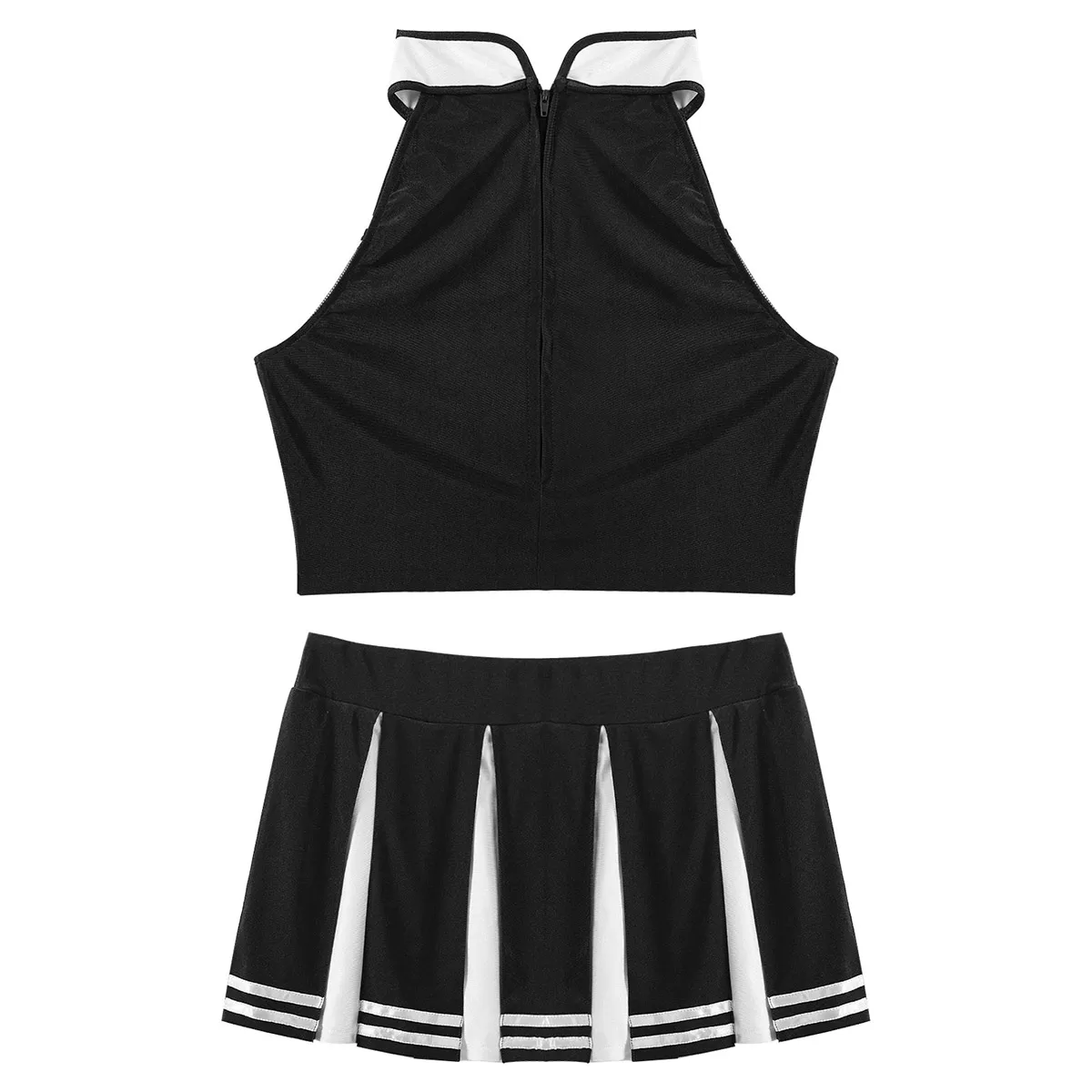 Женский костюм группы поддержки для взрослых # S-XL из 2 предметов; Одежда с воротником-стойкой; Укороченный топ без рукавов с мини-плиссированной юбкой