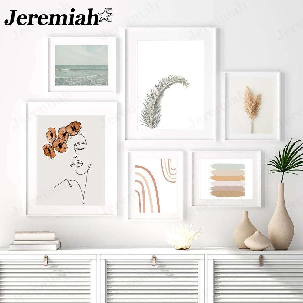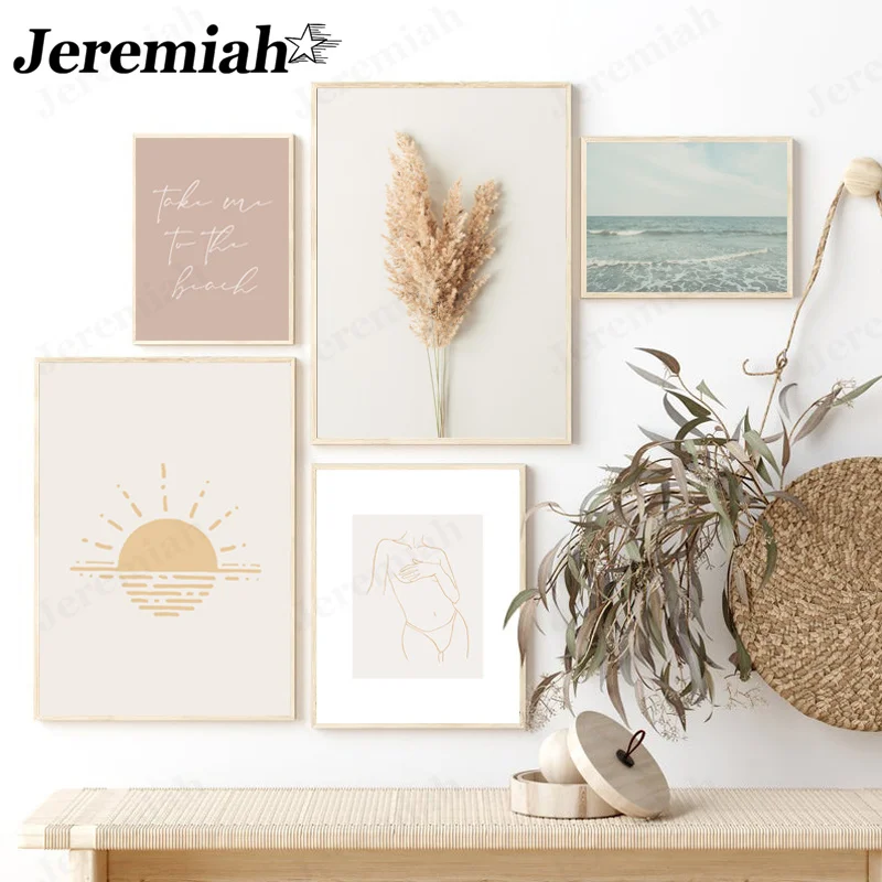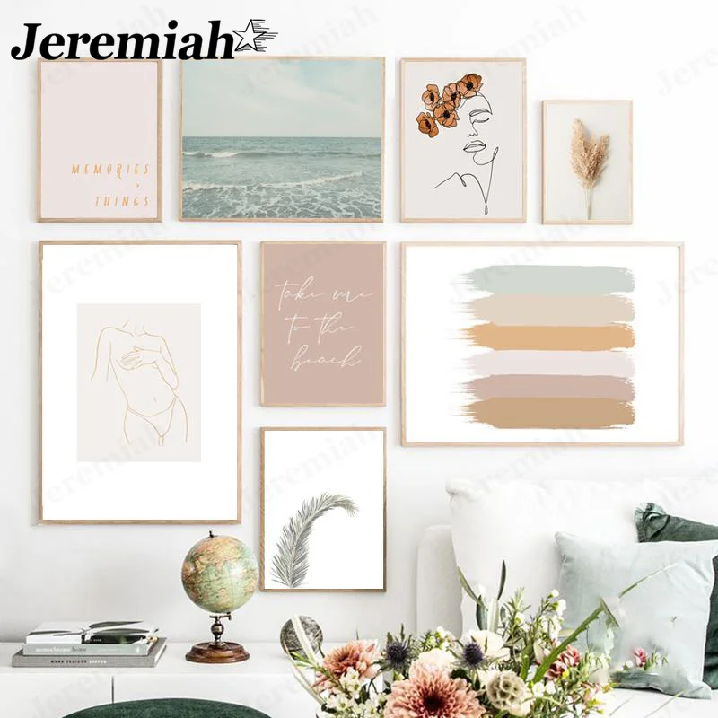 Скандинавский минималистский персонаж Холст плакат абстрактный пляж женщина растительный лист Рид п...