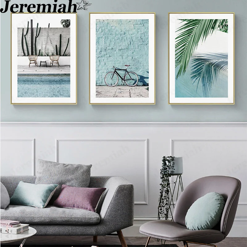 Современная натюрморт холст постер синяя серия велосипедов волн лист Живопись стены искусства...