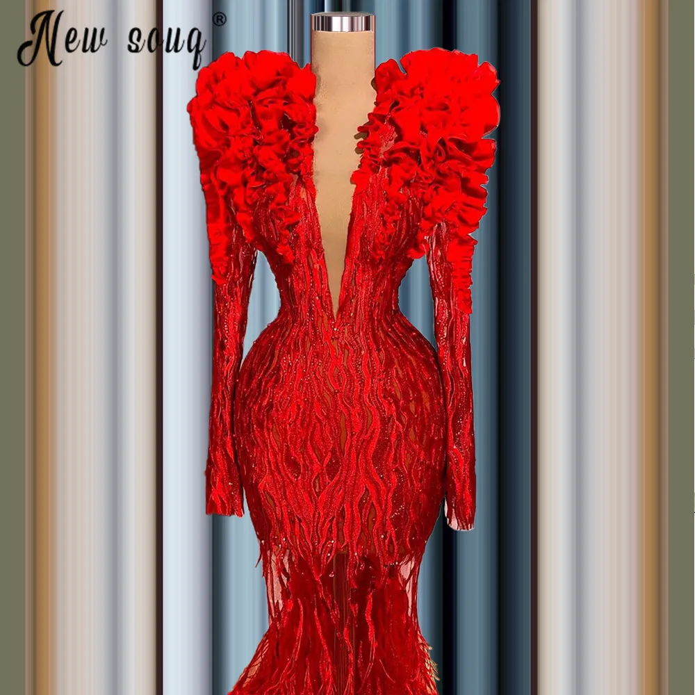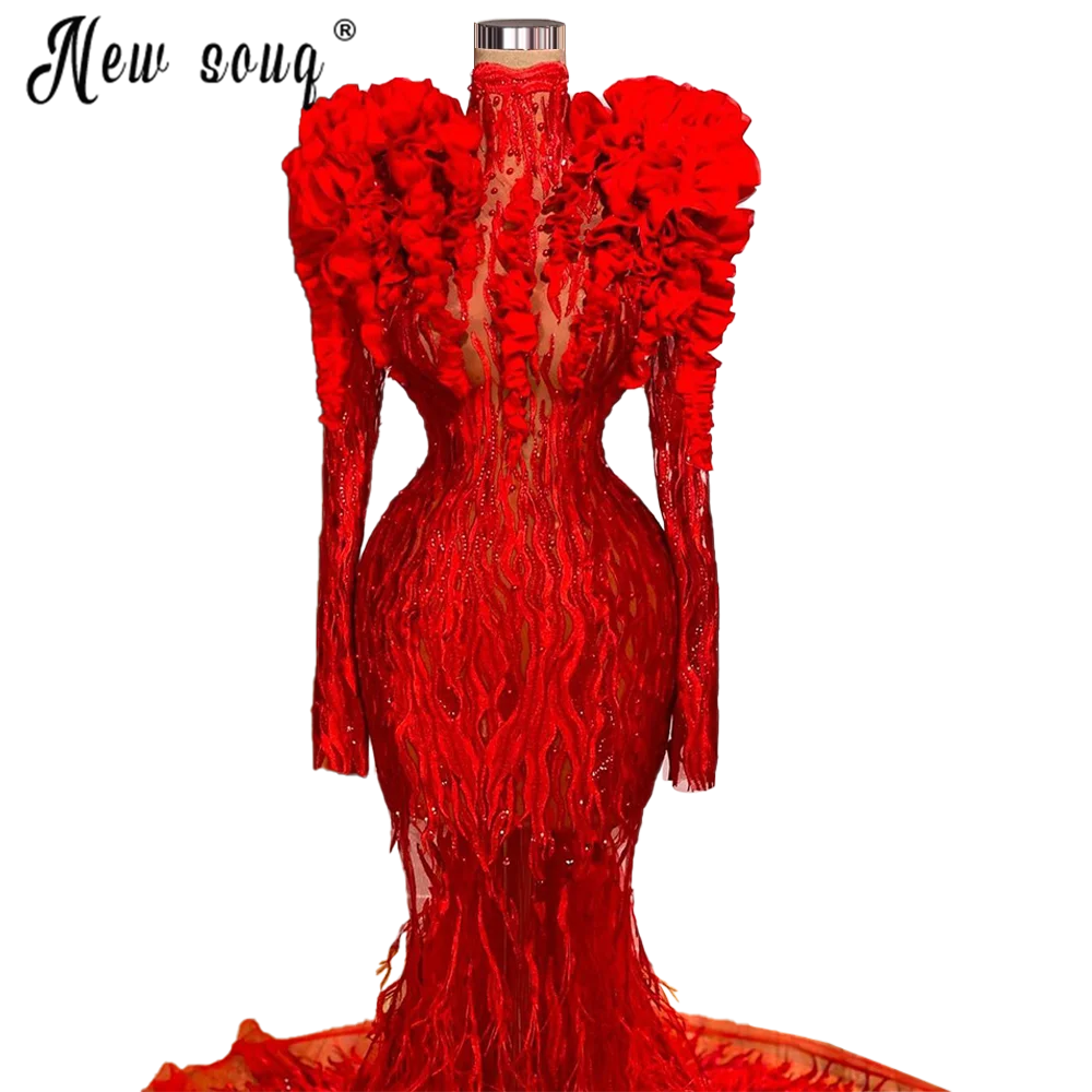 Aso Ebi/красное вечернее платье русалки с оборками, верхняя часть тела, длинные рукава, бисер, официальное платье для выпускного вечера размера плюс, robe de soirée