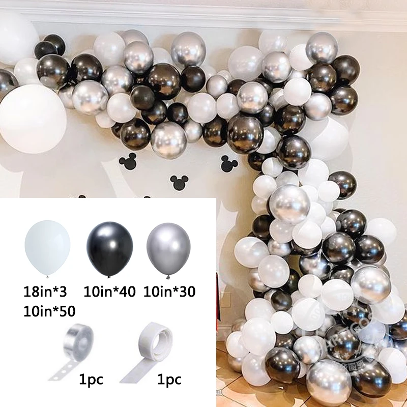 125 шт. = 3 шт. 18 дюймов белый латексный воздушный шар 50 шт. 10 дюймов белый латексный воздушный шар Для выведения токсинов, 40 шт 10 дюймов цвета: металлик, черный латекс 30 шт., 10 дюймов; Цвета: серебристый металлик, латекс 1 шт. 5 м цепочка для воздушных шаров 1 шт. клей