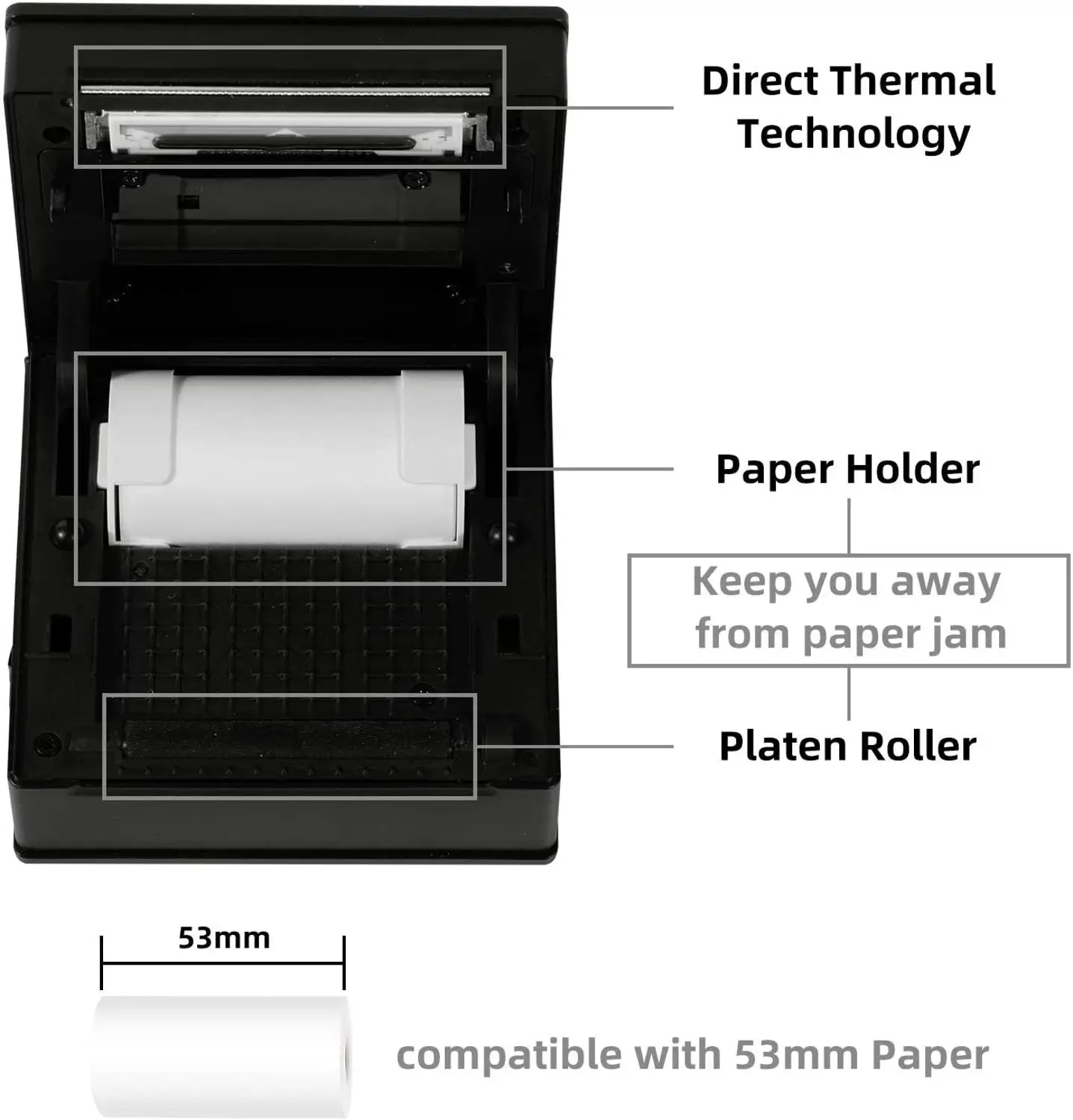 ✔Материал: АБС + металл✔Печатные материалы: термальная бумага✔Тип печати: печать без чернил✔Бумага Ёмкость Спецификация: 53*30 мм/2,08*1,18 в✔Посылка Вес: 190 г✔Аккумулятор: 1000 мАч литиевая батарея (встроенный), может непрерывно печатать 4 рулона бумаги✔Интерфейс: 5 В, micro USB✔Подключение: Bluetooth 4,0✔Система поддержки: для iOS 8,0 + Android 4,0 или выше✔Разрешение: 203 точек/дюйм✔Сетевая печать: поддерживается