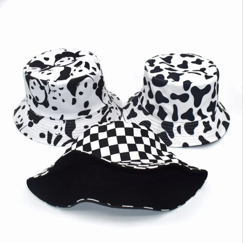 Женские, мужские и женские бейсбольные кепки летние унисекс модная Уличная обувь; Деятельности Реверсивный черный, белый цвет с рисунком коровы ведро Двусторонняя шапки для рыбаков