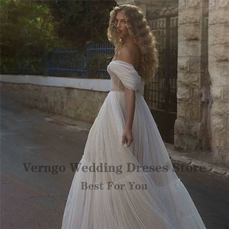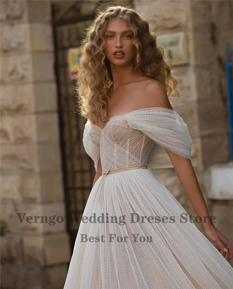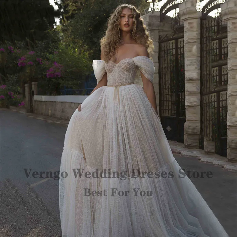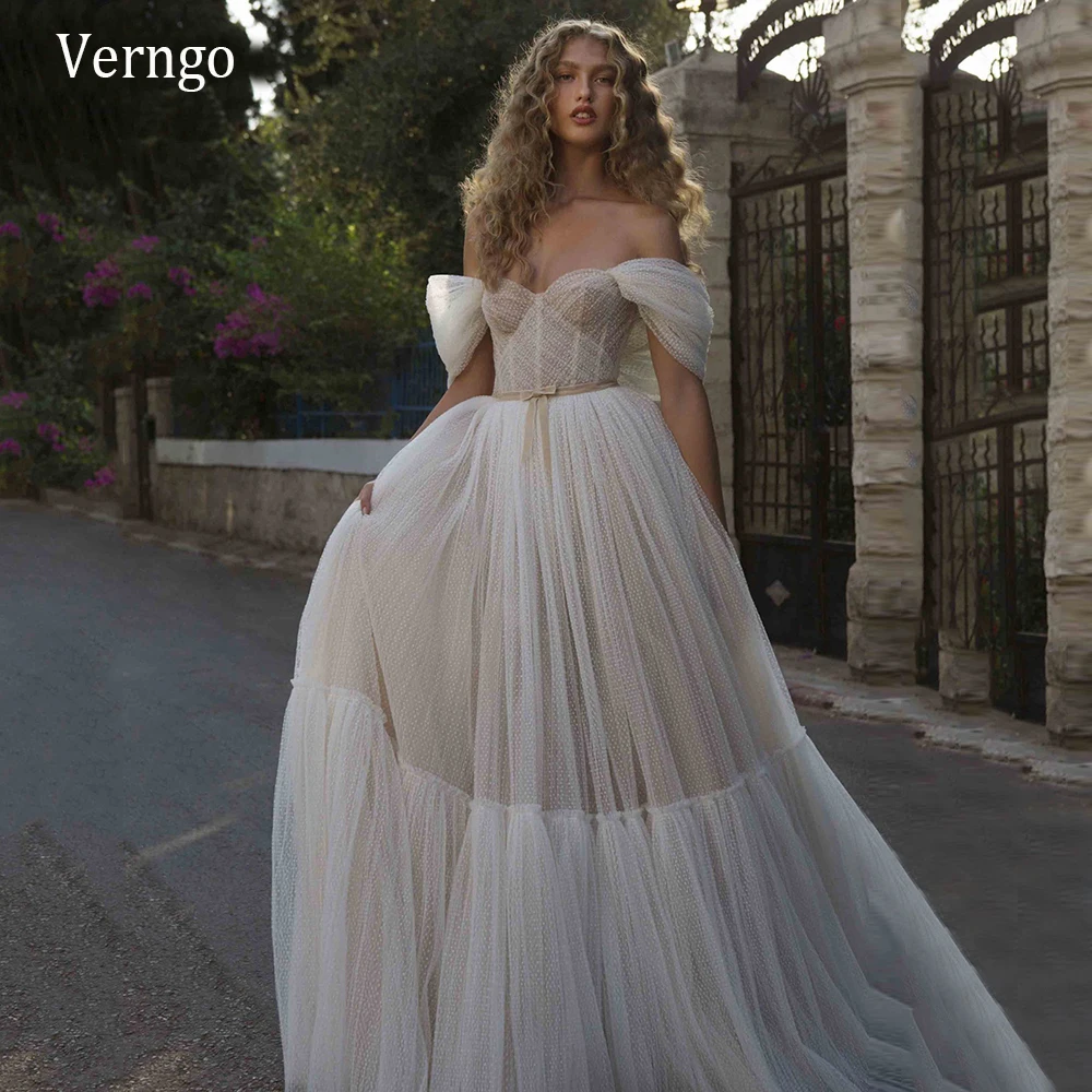 Винтажные трапециевидные тюлевые Свадебные платья Verngo 2021 в горошек с открытыми плечами сердечком с коротким рукавом и шлейфом