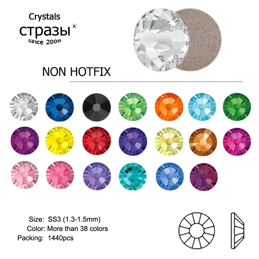 Изделие: Стразы без горячей фиксацииЦвет: яркий, как на изображенииСтиль: плоскийФорма: круглаяКоличество: 1440 шт.Техника: клей наМатериал: Хрустальное стеклоПрименение d: Использование: необходимо использовать клей для сумок, одежды, нейл-арта, обуви, мобильного телефона, коробки, ручки, мебели, поздравительных открыток и т. д.Доставка: USP, DHL, FedEx, EMS, AliExpress доставкаРазмер: SS3