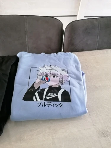 Толстовки достаточно быстро. Приятный на ощупь и теплый, хотя и тонкий (однослойный материал), хорошо подходит для прохладных дней весны. Ищите смесь хлопка и полиэстера благодаря тому, что немного блестит и очень легкий. Иногда locates wystaj① NITKA, но это не проблема. Наклейка выглядит хорошо, хотя иногда цвет материала (Hair Killua-y) и может быть небольшим пятном. За эту цену. Размер M 173 см.