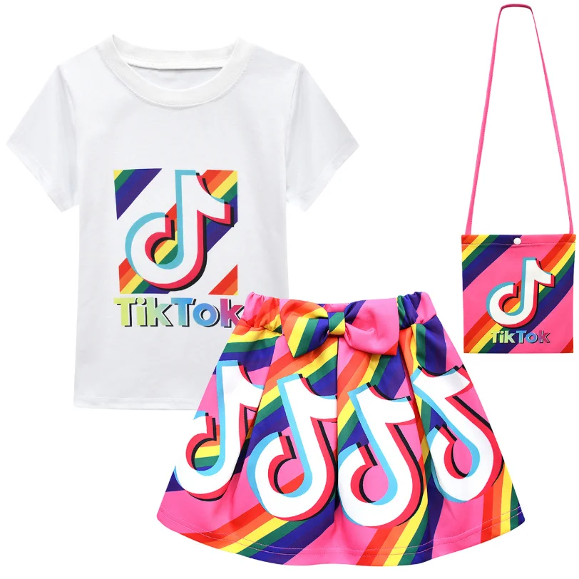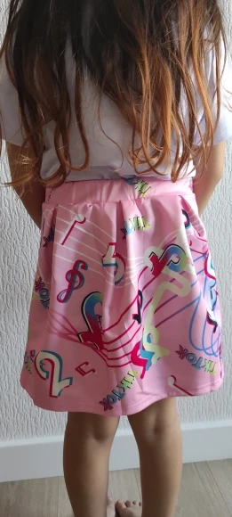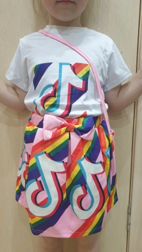 Доставка 2 недели, в почтамат. 100% полиэстер, футболка тоже. На футболке печать, не наклейка. ткань стрейч. Швы обработаны. Футболка длина 52см. Юбка 35,5см. Кнопка на сумочке очень тугая, боюсь быстро сломается или вырвут из ткани, лучше бы сделали молнию или липучки.