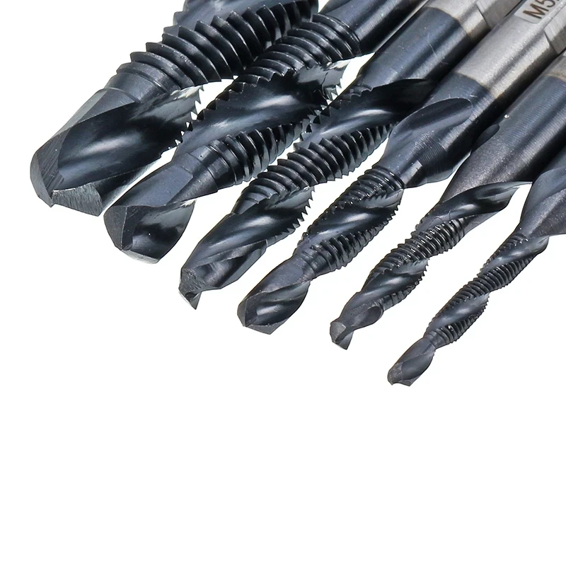 Описание: 6 шт. HRC89 M3-M10 Набор комбинированных сверл набор сверл с покрытием TiAlN Спецификация: Материал: HSS-Co Твердость: HRC89 Покрытие: покрытие TiAlN Размер: M3x0.5, M4x0.7, M5x0.8, M6x1, M8x1.25, M10x1.5