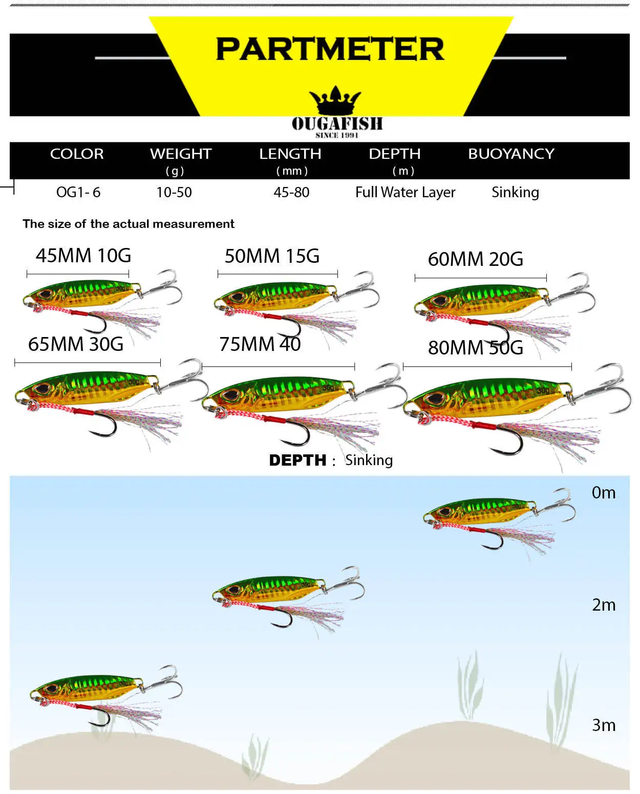 Информация о продукте: Бренд: OUGAFISH Модель приманки: джиг Тип приманки: жесткая рыболовная приманка Вес приманки: 10-50 г Длина приманки: 45-80 мм Глубина погружения: полная вода Плавучесть: погружение Крючки: оснащены антикоррозийными крючками Глаза: 3D рыбий глаз Кольца: одноместный велосипед Цвета: 6 цветов Особенности продукта: 1. Тело приманки принимает передовые материалы защиты окружающей среды, не только имеет высокую ударную прочность, но также не производит вредных веществ для окружающей среды. 2. Приманка предназначена для лучшего баланса, чтобы приманка могла плавать с самой медленной скоростью поиска. 3. Приманки имеют реалистичную картину и яркие 3D глаза, они делают приманку похожей на настоящую рыбу, плавающую в воде во время рыбалки. 4. Красочное тело: дизайн моделирования, более привлекательный для рыб. 5. Крючки: Антикоррозийная, более мощная, прочная, пресная вода морская вода универсальная. 6. Металлические шарики: шарики из нержавеющей стали внутри, чтобы сохранить баланс приманки для рыбалки, для дальнего расстояния литья. 7. Более сильные Бициклические Кольца: усиливает двойной круг повышенное сопротивление тяге. 8. Имитация кожи рыбы (лазер): дизайн имитации кожи рыбы делает ее более привлекательной для больших рыб. 9. В отличие от популярных экономичных склеивания, сделанных популярными компаниями. Bearking использует подробный, трудоемкий процесс. 10. Обработка краев и точный процесс удаления заусенцев уменьшает шероховатую площадь приманки для гладкой поверхности. 11. Для проверки целостности адгезии приманки тестируются на воду, погружаются в горячую воду с температурой более 70 градусов в течение примерно 20 секунд.