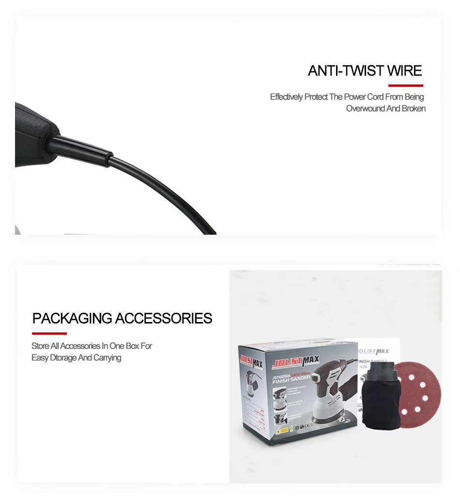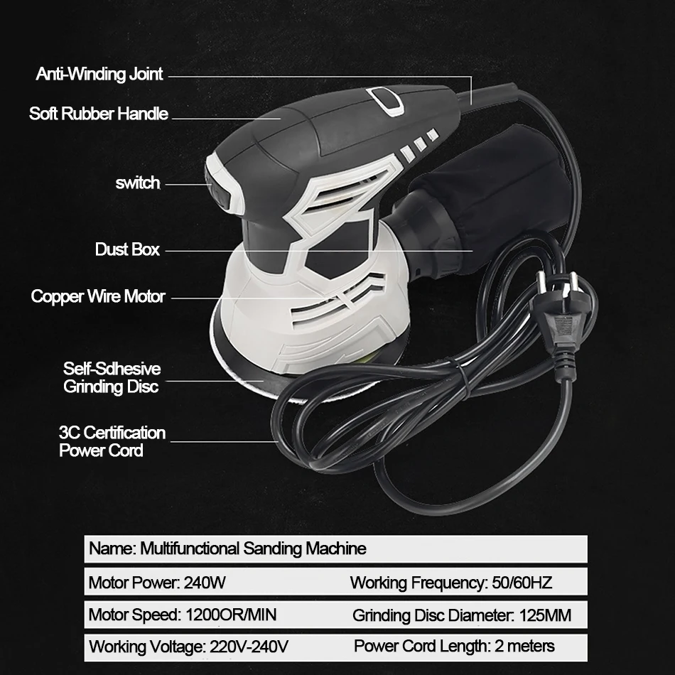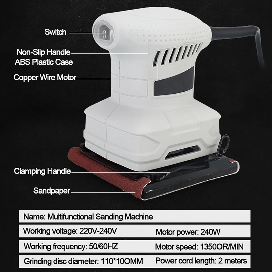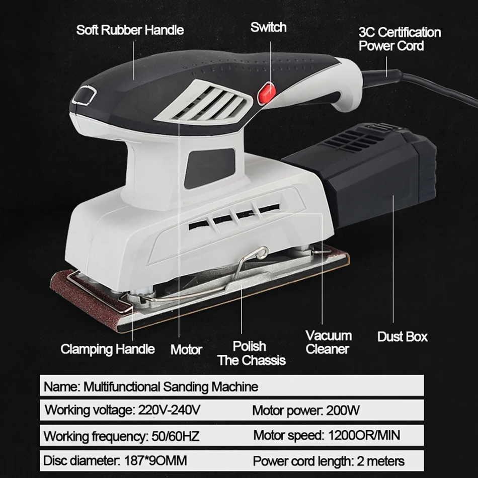 Особенности: 1. Весь медный корпус 2. АБС-пластик шасси 3. Конструкция функции сбора пыли 4. Сильная теплоотдача 5. Пыленепроницаемый дизайн Спецификация: Круглый шлифовальный станок Размер: 20*12,5*17 см Рабочее напряжение: 220-240 В Мощность двигателя: 240 Вт Рабочая частота: 50/60 Гц Скорость холостого хода: 12000 об/мин Диаметр шлифовального диска: 125 мм Длина провода: 2 м Квадратный шлифовальный станок Размер: 18,5*12*17 см Рабочее напряжение: 220-240 В Мощность двигателя: 240 Вт Рабочая частота: 50/60 Гц Скорость холостого хода: 13500 об/мин Диаметр шлифовального диска: 110*100 мм Длина провода: 2 м Прямоугольная шлифовальная машина Размеры: 28,5*11*16,5 см Рабочее напряжение: 220-240 В Мощность двигателя: 240 Вт Рабочая частота: 50/60 Гц Скорость холостого хода: 12000 об/мин Диаметр шлифовального диска: 187*90 мм Длина провода: 2 м Диапазон использования: Полировка стен Шлифовальная доска Полировка шпатлевки Полировка металла Отделка краски Полировка мебели