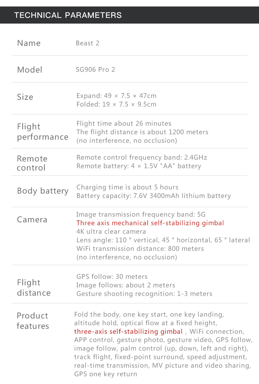 Срок службы: SG906 PRO: 7,4 В, 2800 мАч, аккумулятор около 25 мин/SG906 PRO 2: 7,6 В, 3400 мАчОколо 26 мин