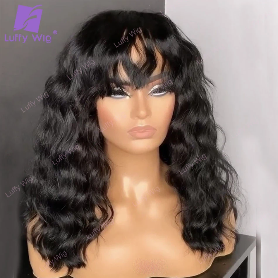 Бесклеевые парики из человеческих волос с челкой, бразильские волосы без повреждения кутикулы, волнистые волосы, машинный парик, плотность 200%, для черных женщин, Луффи