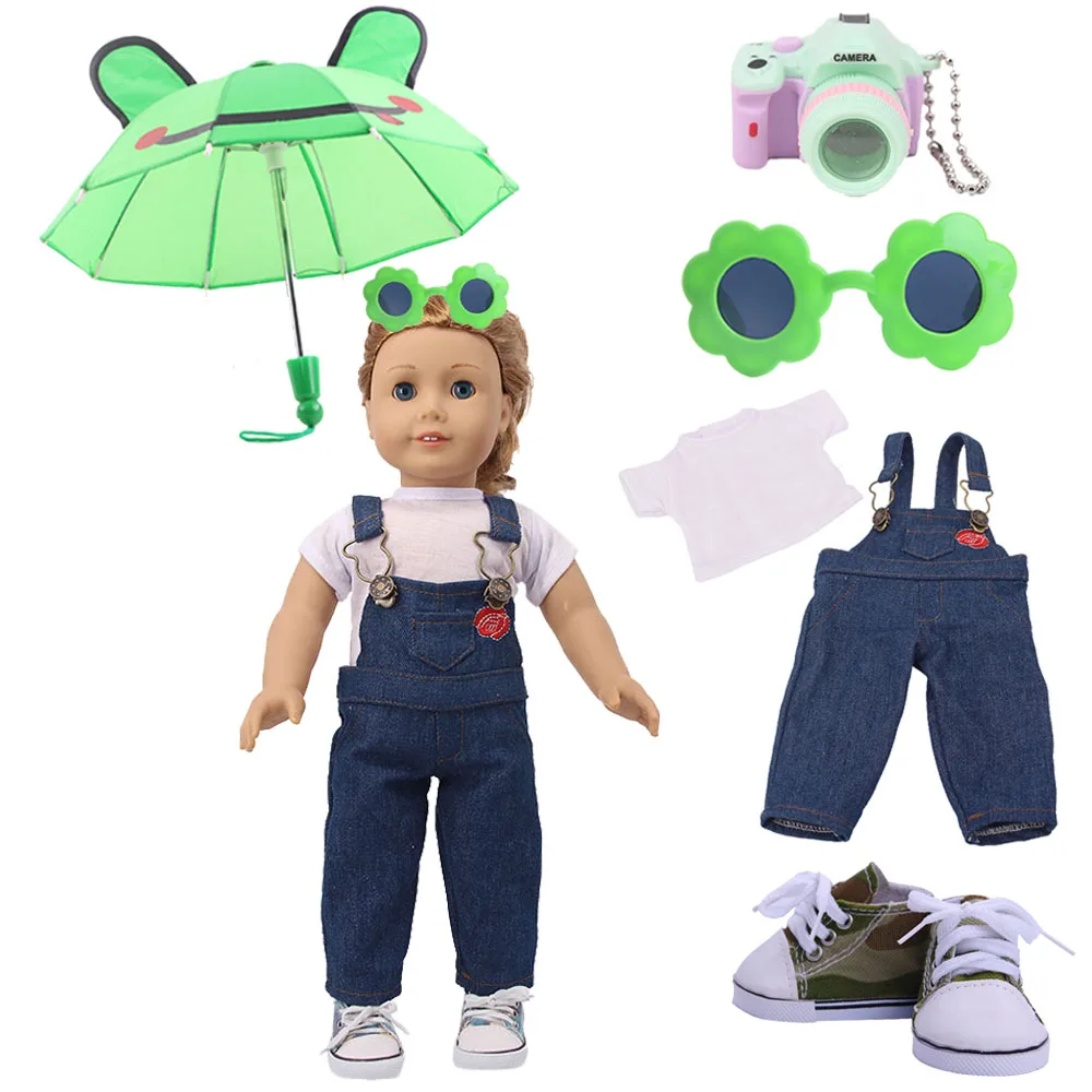 Бесплатная доставка кукольная одежда, партиями по 5 комплектов = зонтик для девочек + джинсовый костюм + туфли + Камера + очки для 18 дюймов с капюшонами в американском и 43 см для ухода за ребенком для мам реборн новорожденного кукла OG
