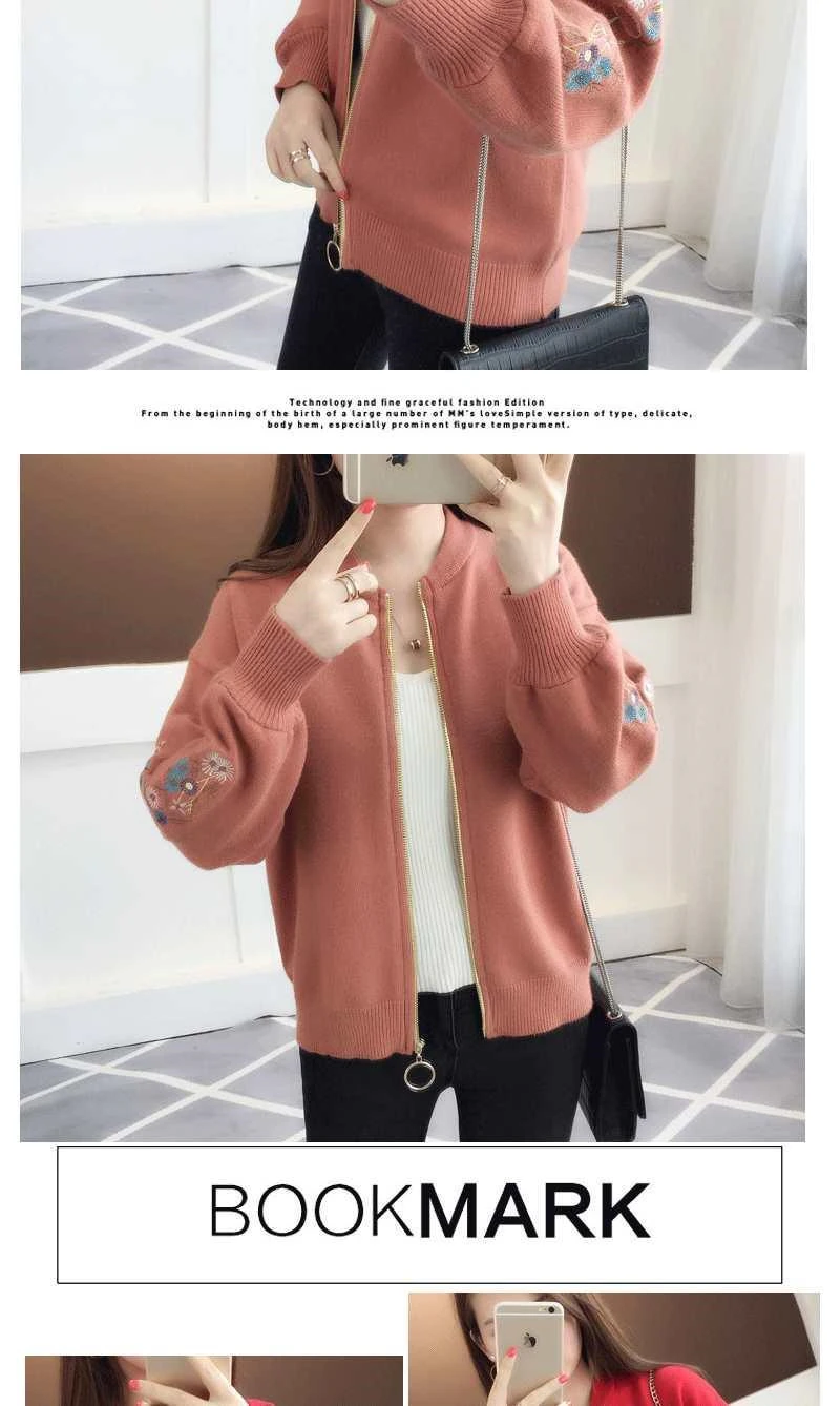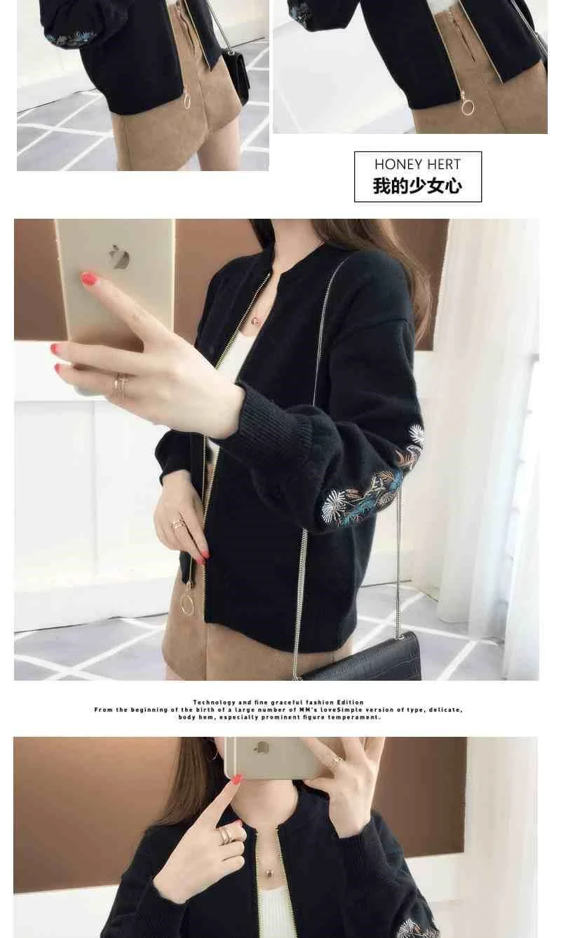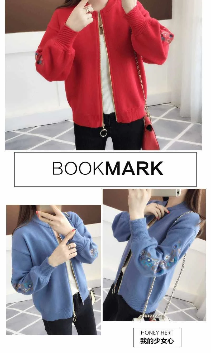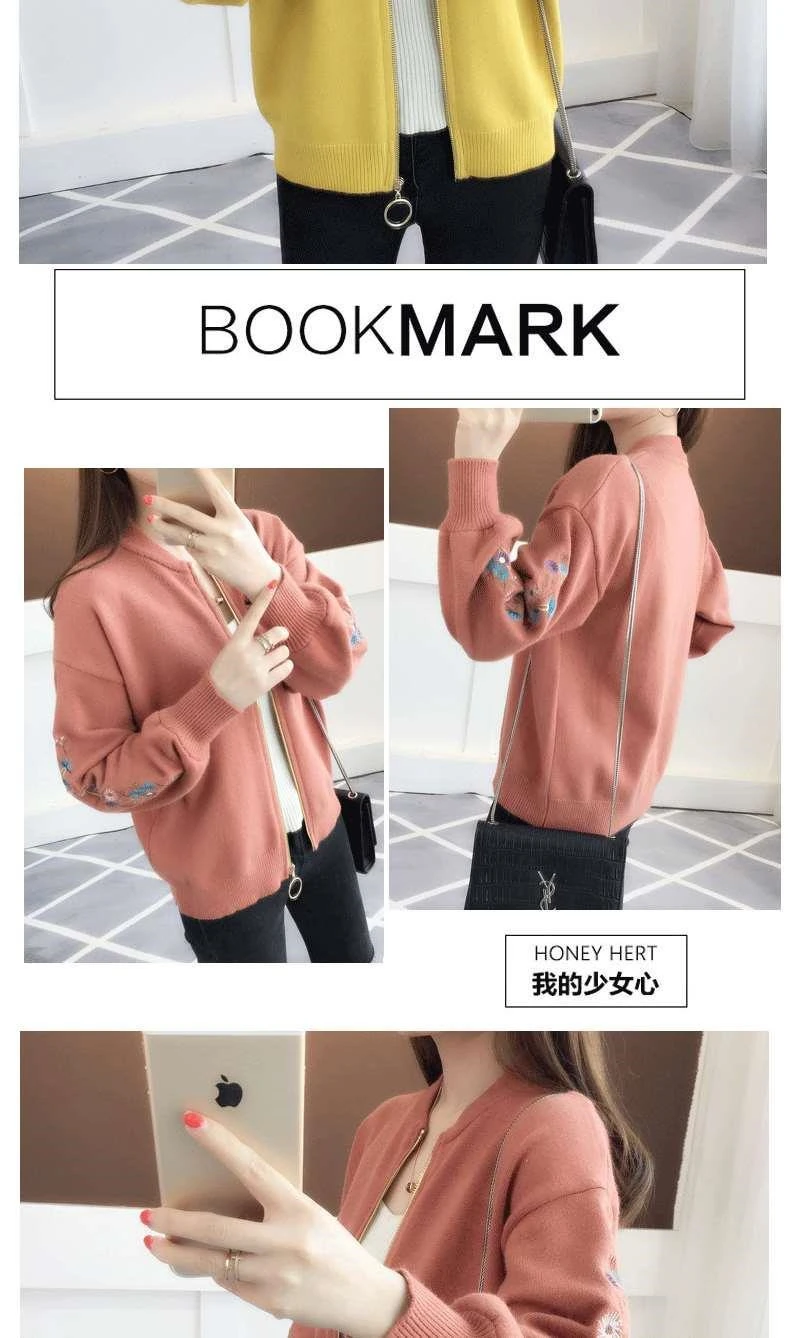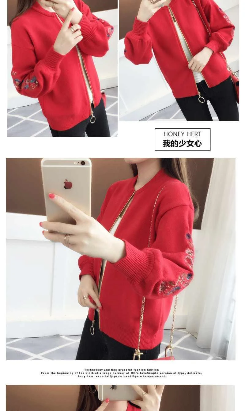 Однотонный вязаный кардиган с вышивкой, пальто, женский корейский свитер на молнии с круглым вырезом и длинным рукавом, Весенняя Повседневная бейсбольная верхняя одежда, топы