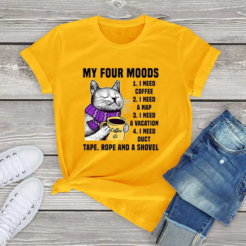 Забавная Хлопковая женская футболка с изображением кота My Four Moods I Need Coffee Nap для отпуска, винтажная Мужская футболка белого цвета, кавайная одежда для девушек в стиле 90-х, летние футболки в стиле Харадзюку, топы большого размера, уличная одежда xs-xxxxl