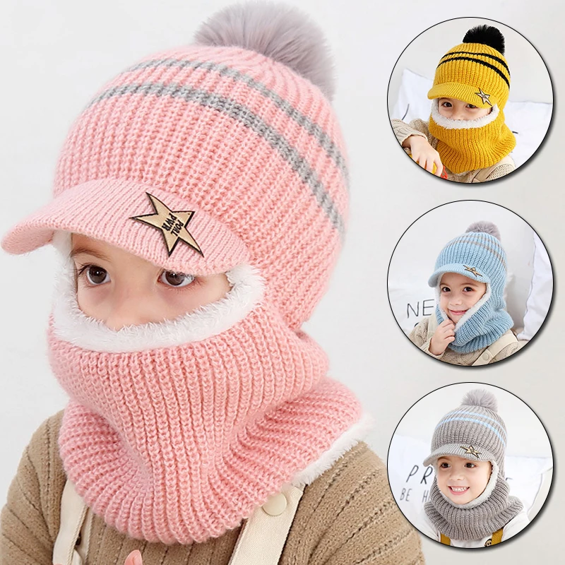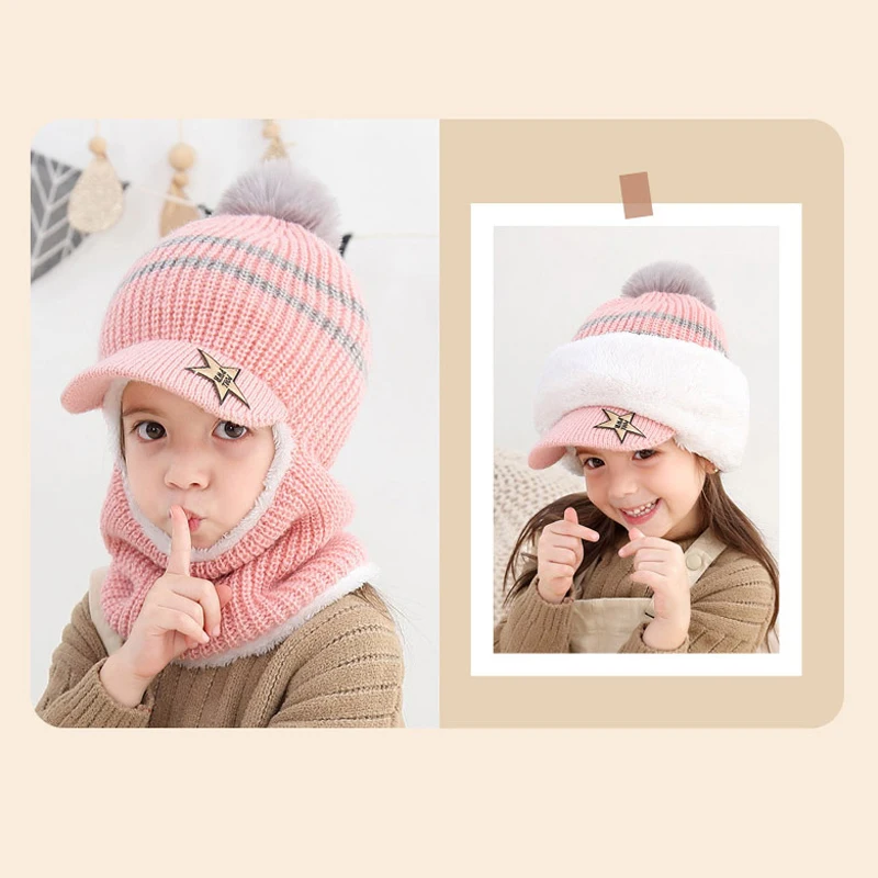 Детские осенне-зимние теплые шапки, Детская вязаная шерстяная шапка с капюшоном, шарф для лица для девочек и мальчиков, мягкие эластичные шапки розового цвета для малышей