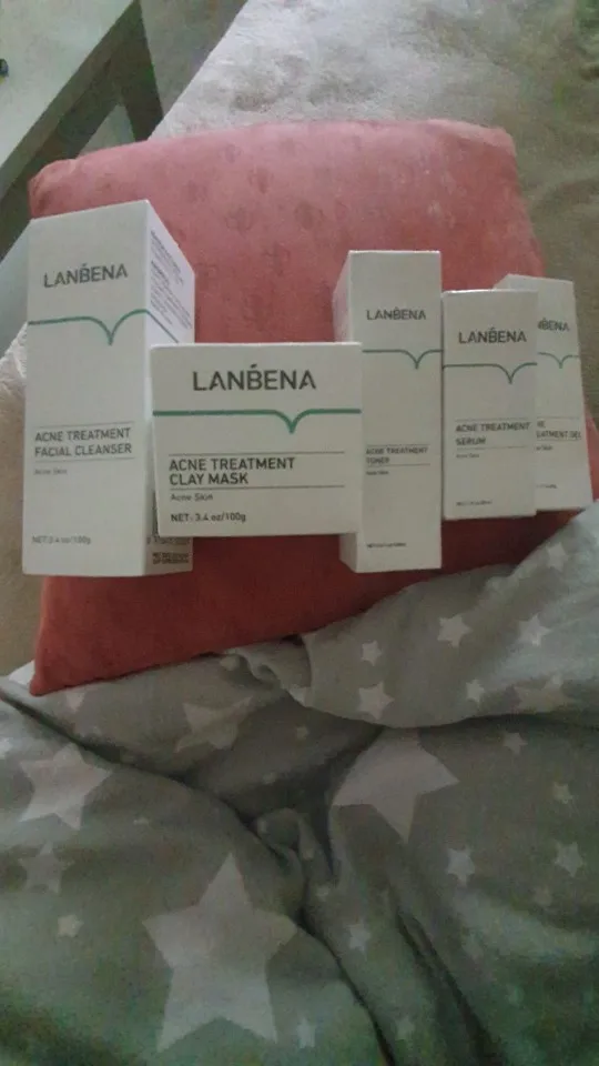 Хороший набор состоящий из пяти продуктов : гель для умывания, тоник для лица, глиняная маска, сыворотка против чёрных точек, крем против чёрных точек. Все продукты направлены на очищение и устранение акне.На каждой упаковке есть номер подтверждающий оригинальность продукта, его можно проверить на официальном сайте магазина LANBENA. Каждая коробка запакована в прозрачную упаковку, к сожалению в пути помялись, но сам продукт не пострадал. Гель для умывания имеет кремовую белую текстуру, при умывании пенится. После применения кожа становится мягкой и матовой и нежно сияет. Глиняная маска, сыворотка и крем имеют охлаждающей эффект. Делают покраснения менее выражеными. Сыворотка имеет яркий жёлтый цвет, моментально впитывается и делает кожу матовой. Крем увлажняет кожу, а маска делает её бархатной. Тоник убирает жирный блеск, но не стягивает. До Московской области посылка пришла за месяц. Итог применения дополню позже.