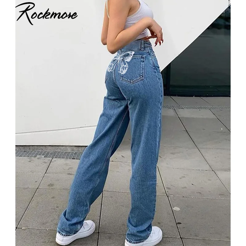 Женские джинсы с высокой талией и принтом бабочки Rockmore, уличные брюки 90s, мешковатые прямые брюки, повседневные джинсы в стиле Харадзюку