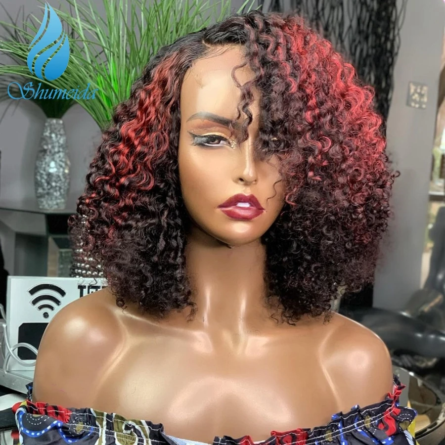 Парик Shumeida из натуральных человеческих волос 13*6*1 на сетке спереди, парик с эффектом омбре красного цвета, Короткие вьющиеся парики, Детские волосы, перуанские волосы без клея, парики на сетке