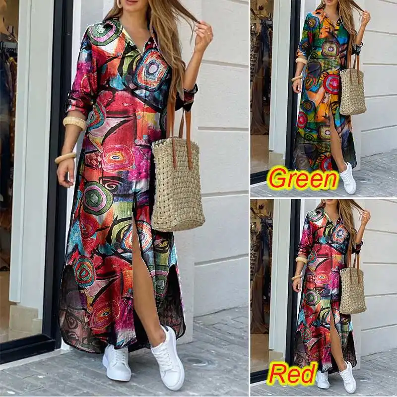 Женское длинное платье с принтом, Осенний сарафан с лацканами и пол...
