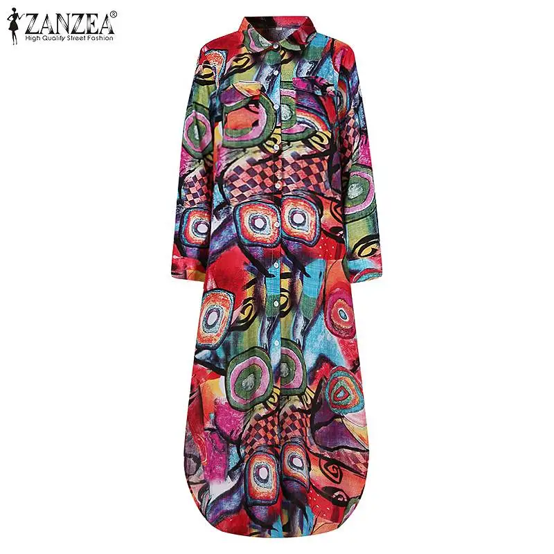 Винтажное платье-рубашка с принтом, женский весенний сарафан ZANZEA 2022, Платье макси с длинным рукавом, женское платье на пуговицах с разрезом