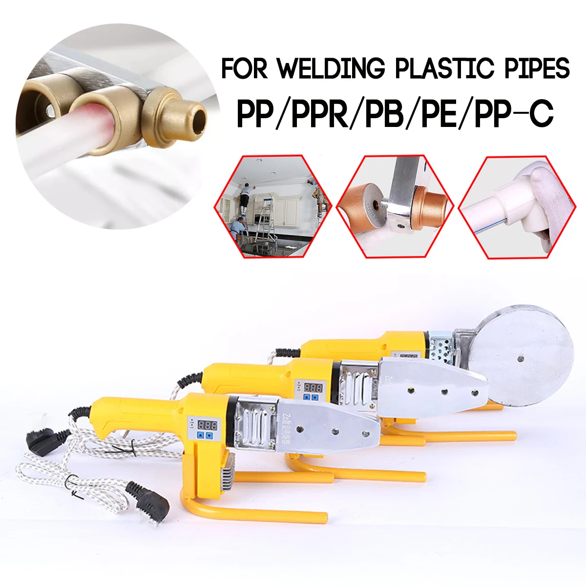 Особенности-Для сварки пластиковых труб, таких как PP / PPR / PB / PE / PP-C трубы и т. Д.-Предназначен для длительного использования.-Нескользящая ручка, удобно брать.-Подходит для трубопроводного строительного оборудования.-Марганцевая стальная панель, быстрая теплопроводность.-Толстая сенсорная головка золотого цвета, Быстрое нагревание горячего плавления.