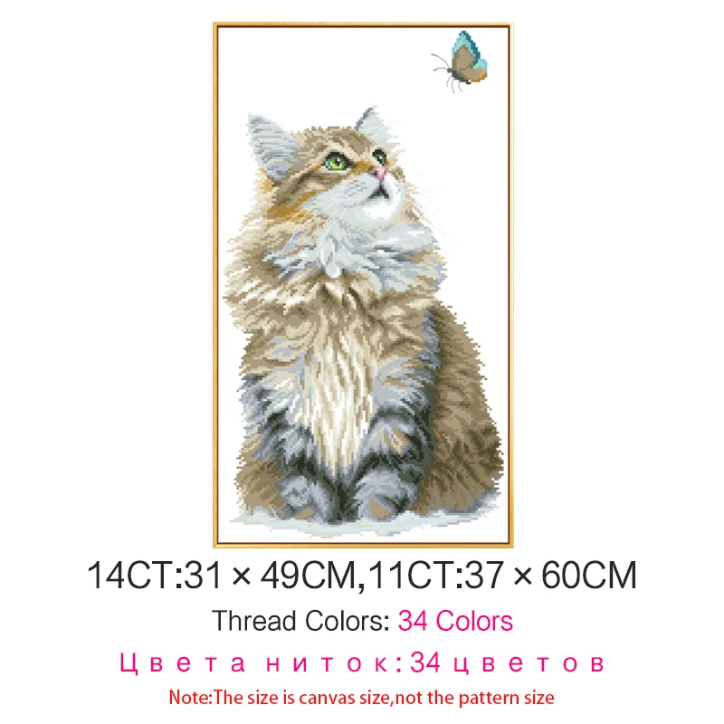 Кот и бабочка:14CT:31 × 49 см11CT:37 × 60 смЦвета резьбы: 34 Цвета